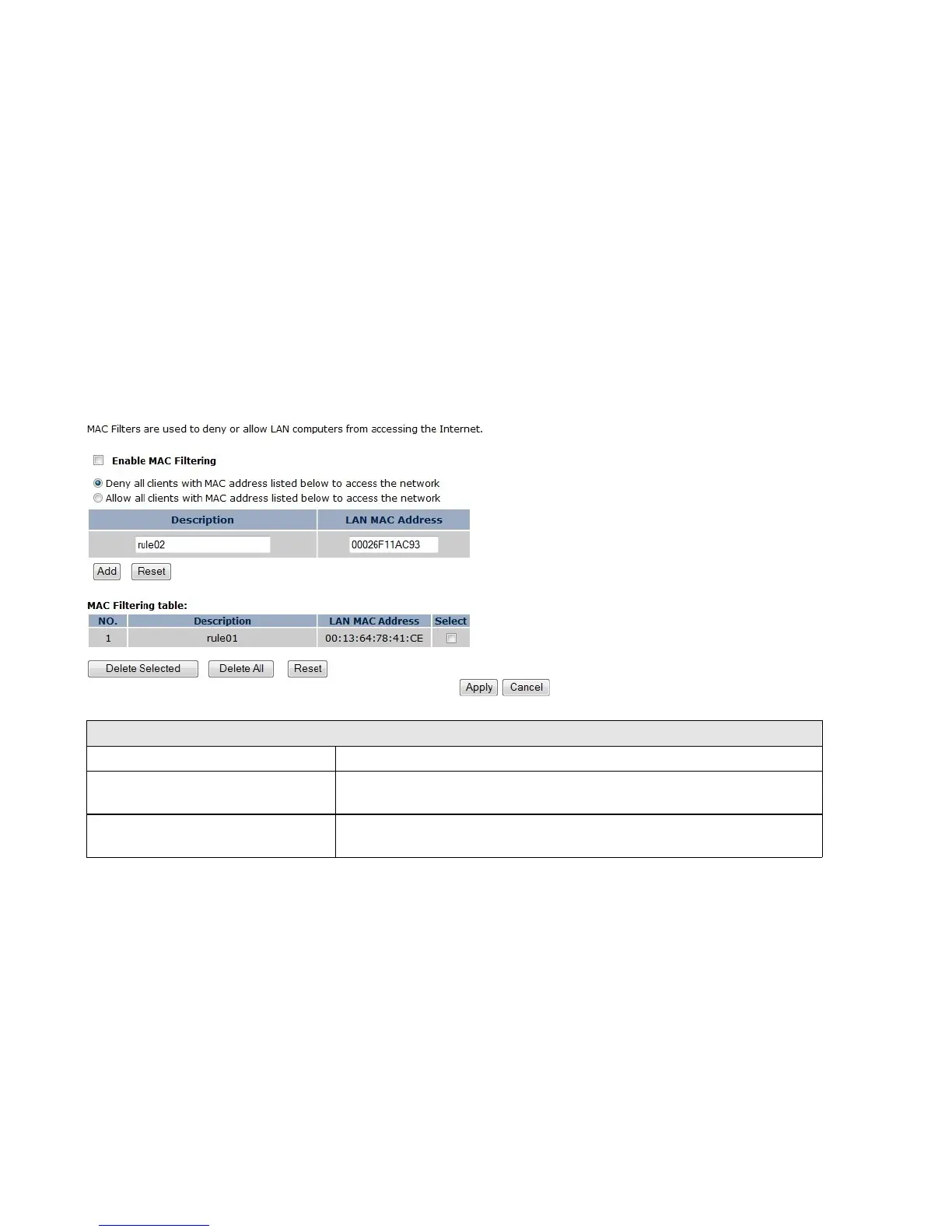 When selected, the computers listed in the MAC Filtering table will be Denied
