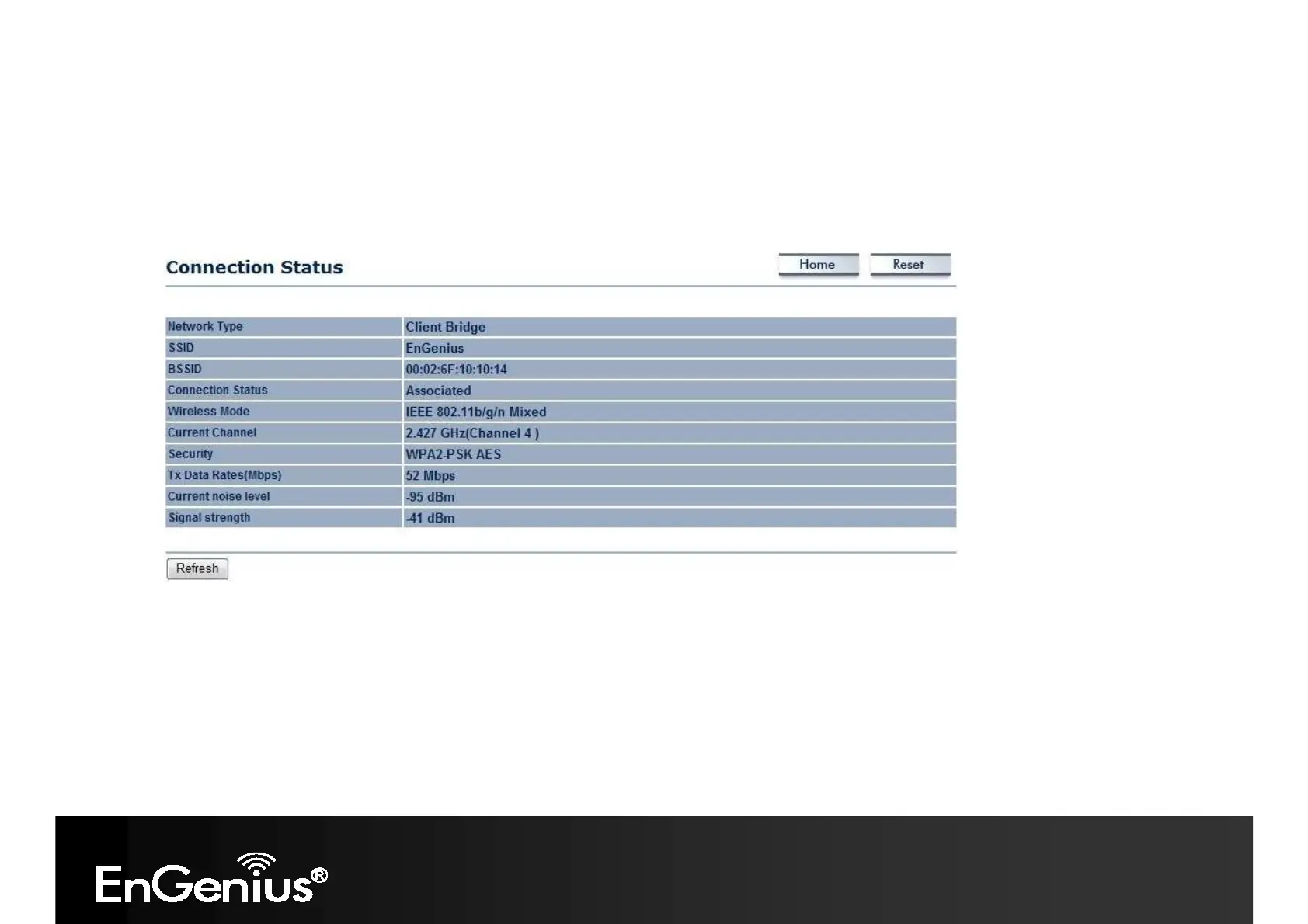 Click on the Connection Status link under the Status menu. This page displays the current status of the network,