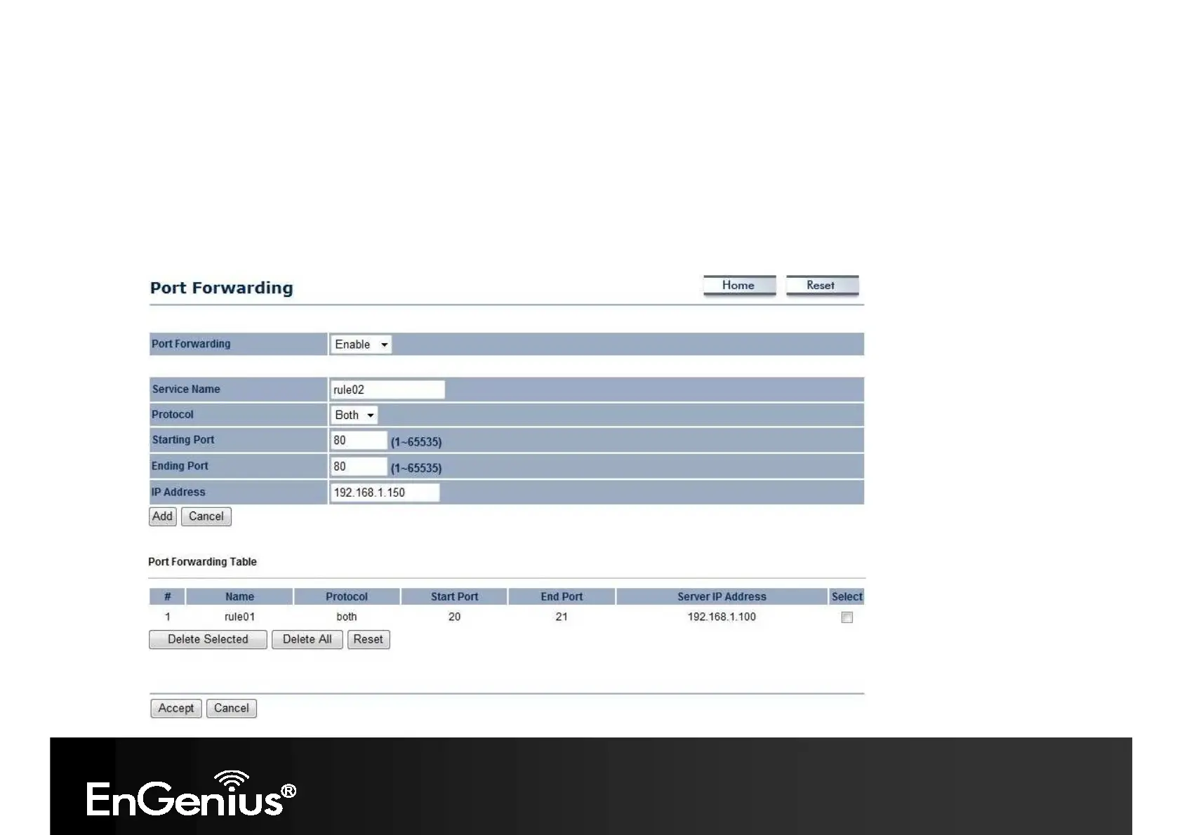 (HTTP) to be forwarded to IP address 192.168.1.150, all HTTP requests from outside users are forwarded to