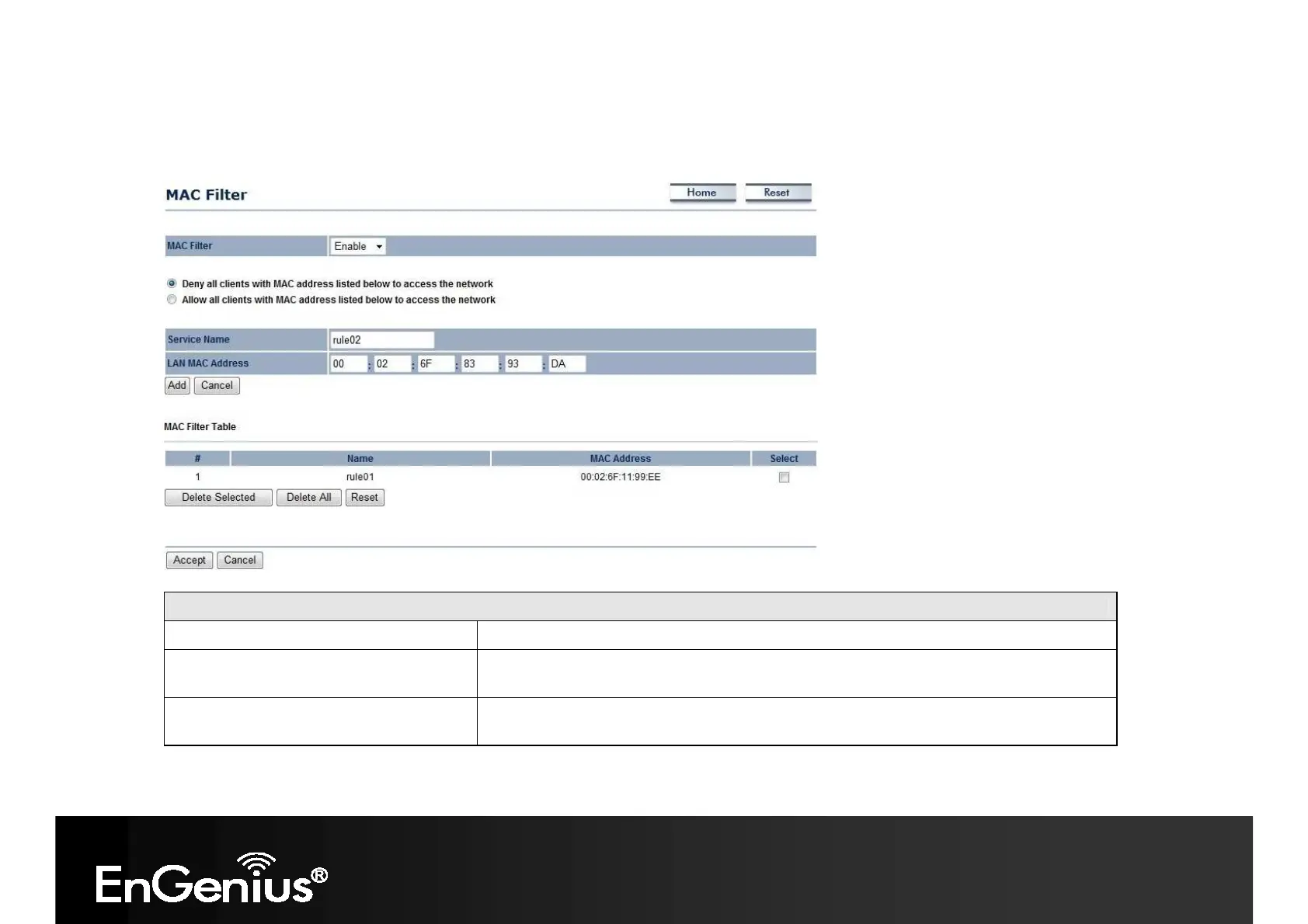 When selected, the computers listed in the MAC Filter table will be Denied to access