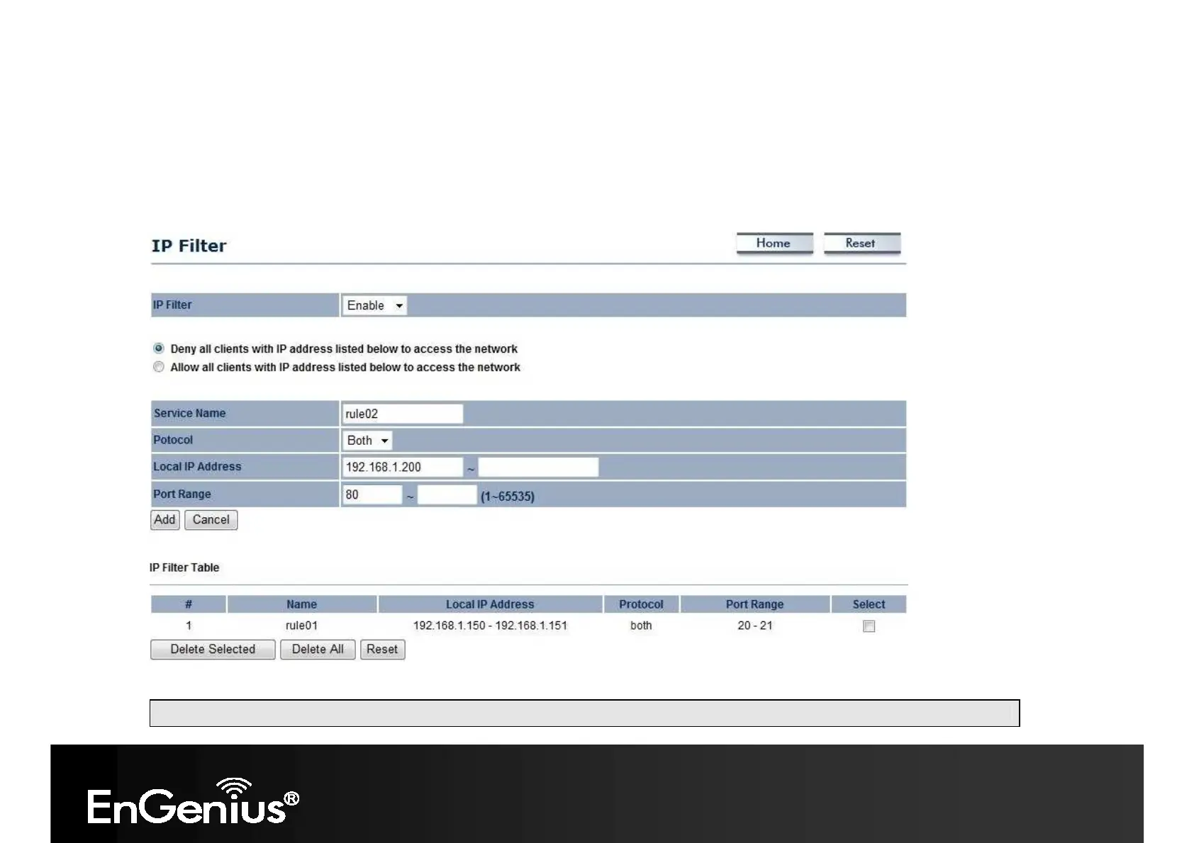 You can choose whether to Deny or Allow only devices with those IP Addresses listed on the IP Filter Table from