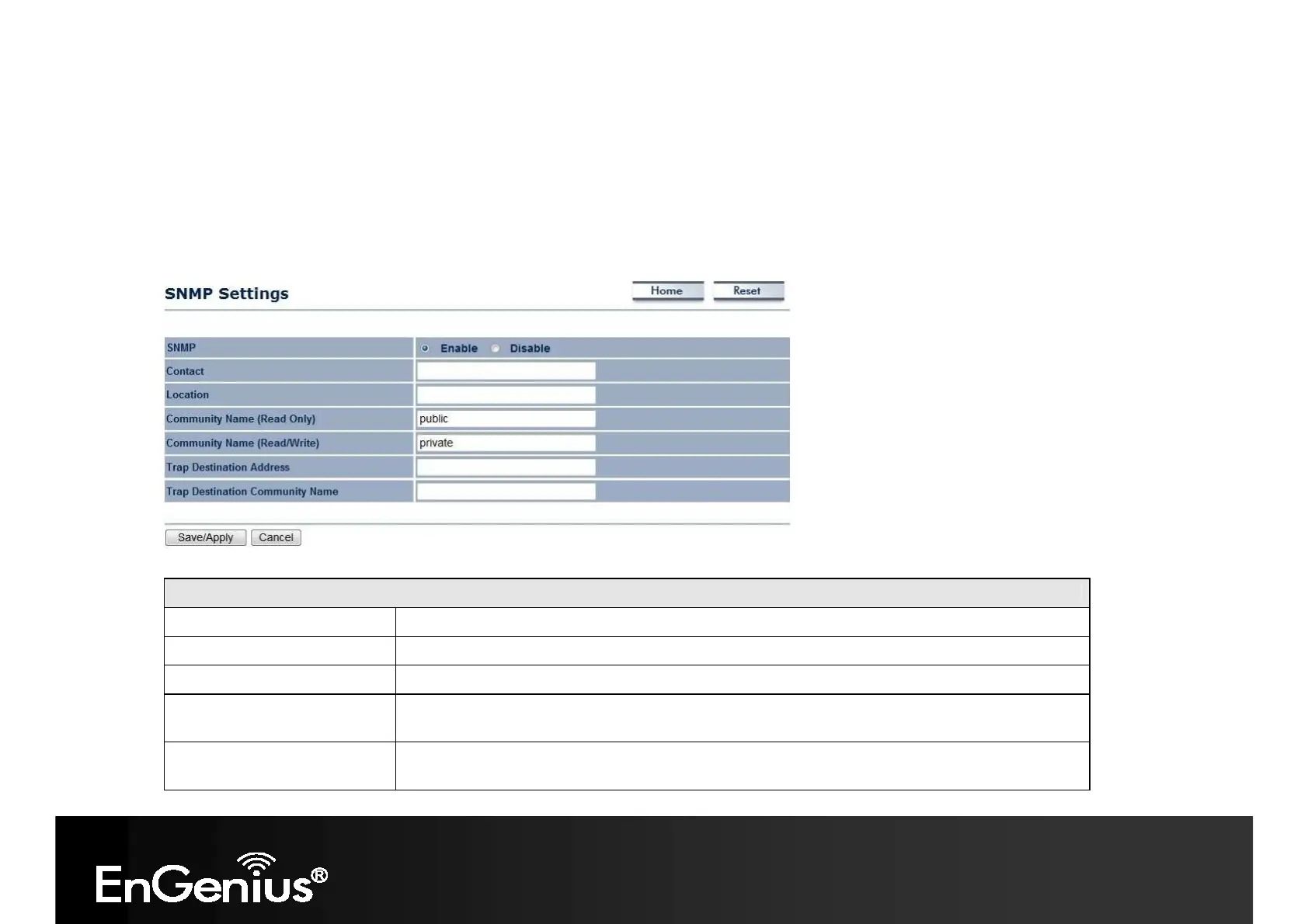 This page allows you to assign the contact details, location, community name and trap settings for SNMP. This is a