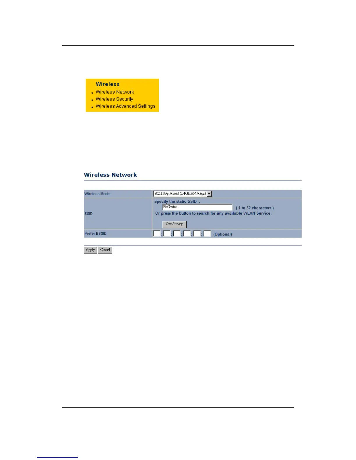 exceed 32 characters. You may specify an SSID or select one from the Site Survey.
