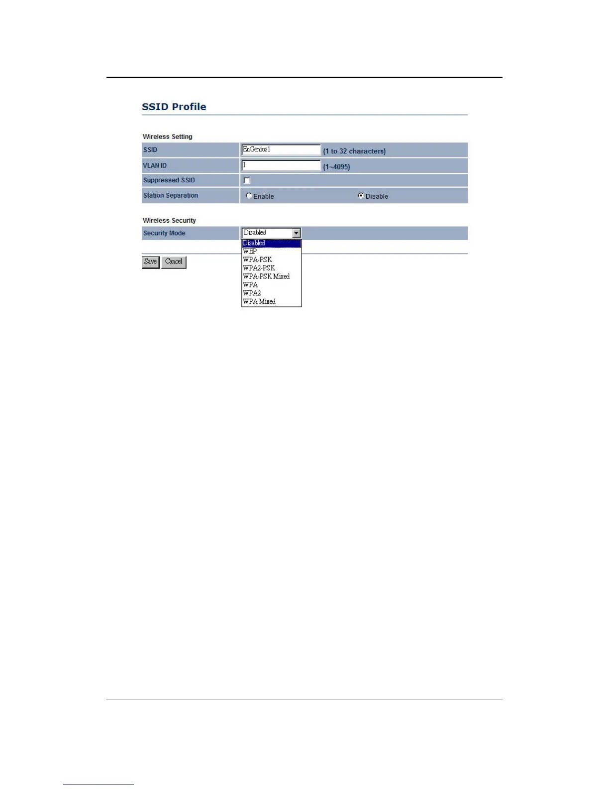 Security Mode: By default, the security is disabled. Refer to the next section to