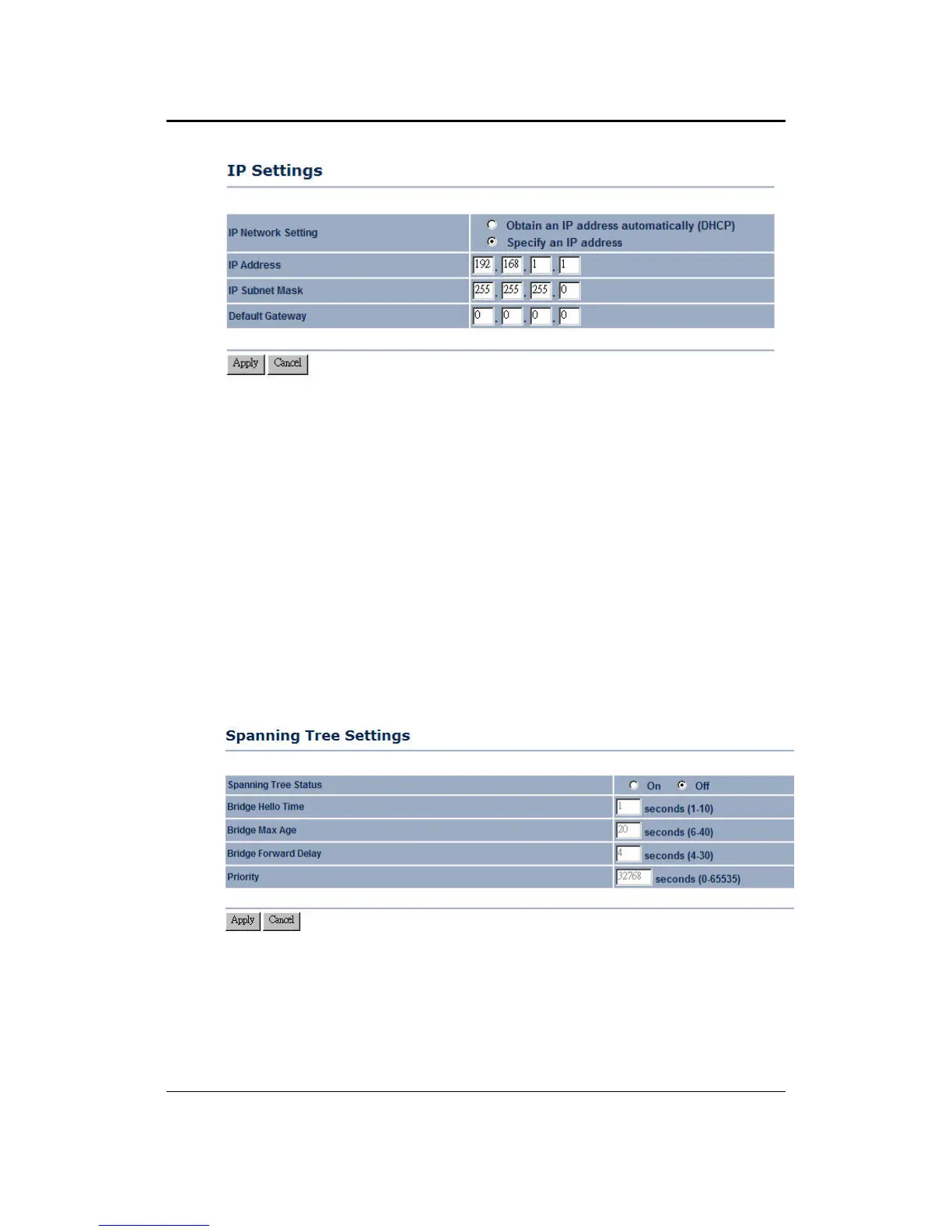 Spanning Tree Status: Choose to enable or disable the spanning tree feature.