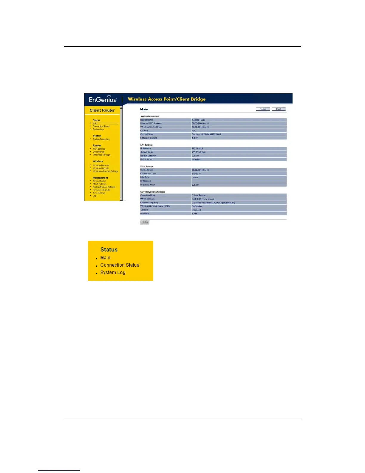 mask, and MAC address are displayed in the ‘LAN’ section. In the ‘Wireless section,