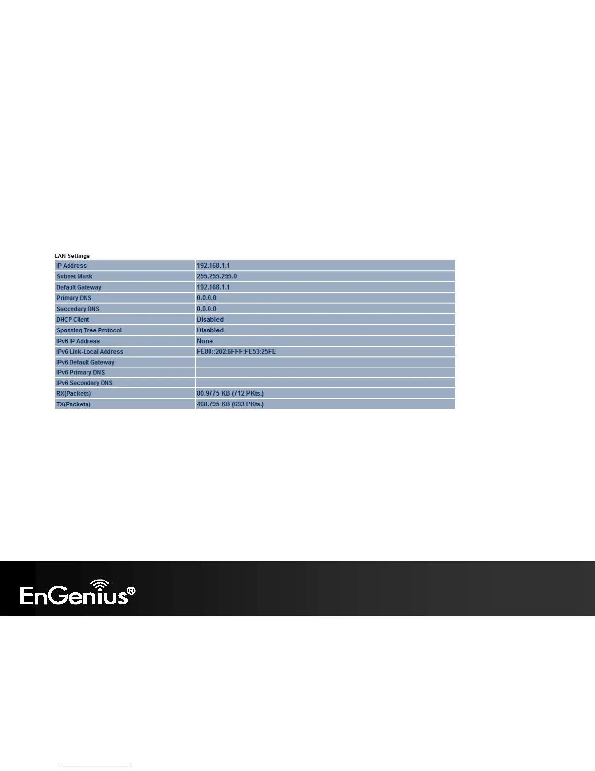 - The LAN Settings section shows the Local Area Network settings such as the LAN IP Address, Subnet Mask, DNS