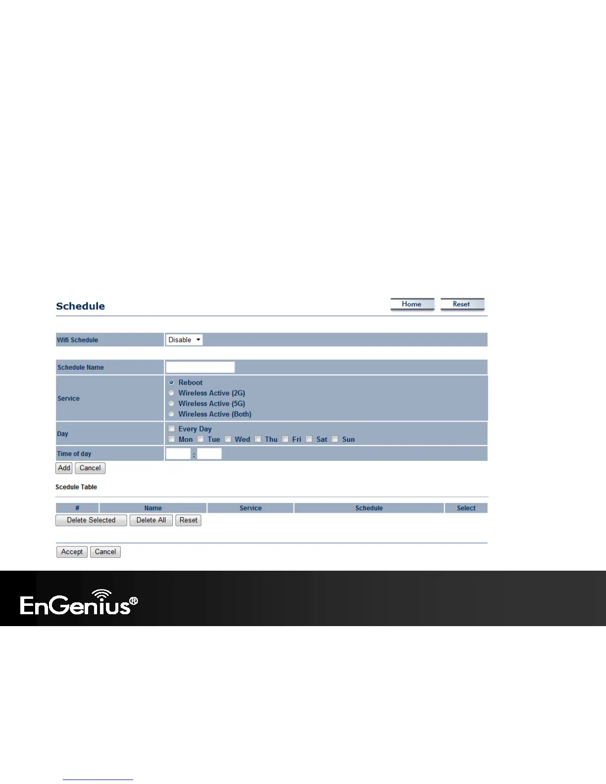 Use the schedule function to control the wireless on/off or reboot ECB600 on a routine basis. The Schedule function relies