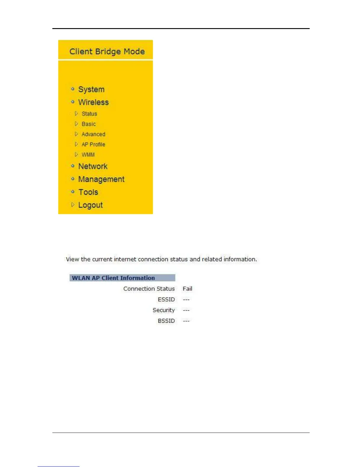 the current wireless settings such as SSID, Channel, Security and BSSID (MAC