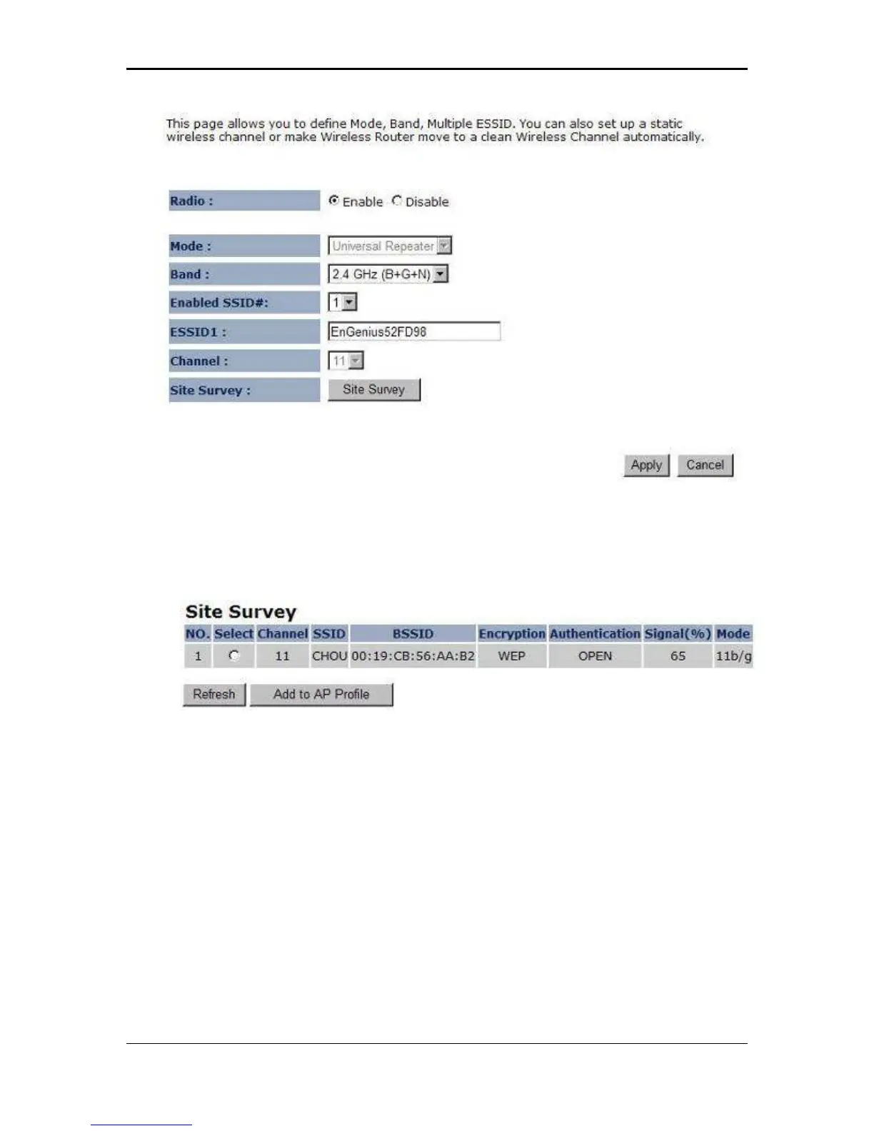 Site Survey page displays information about devices within the 802.11b/g/n frequency.