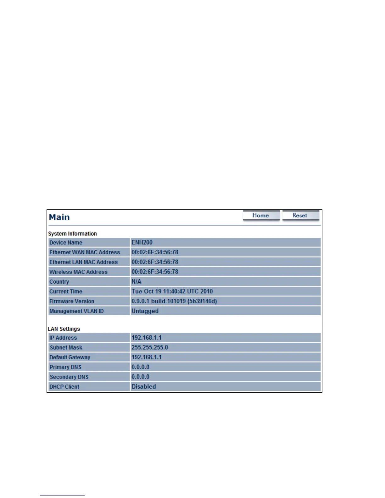Clicking the Main link under the Status drop-down menu or clicking Home at the top-right of