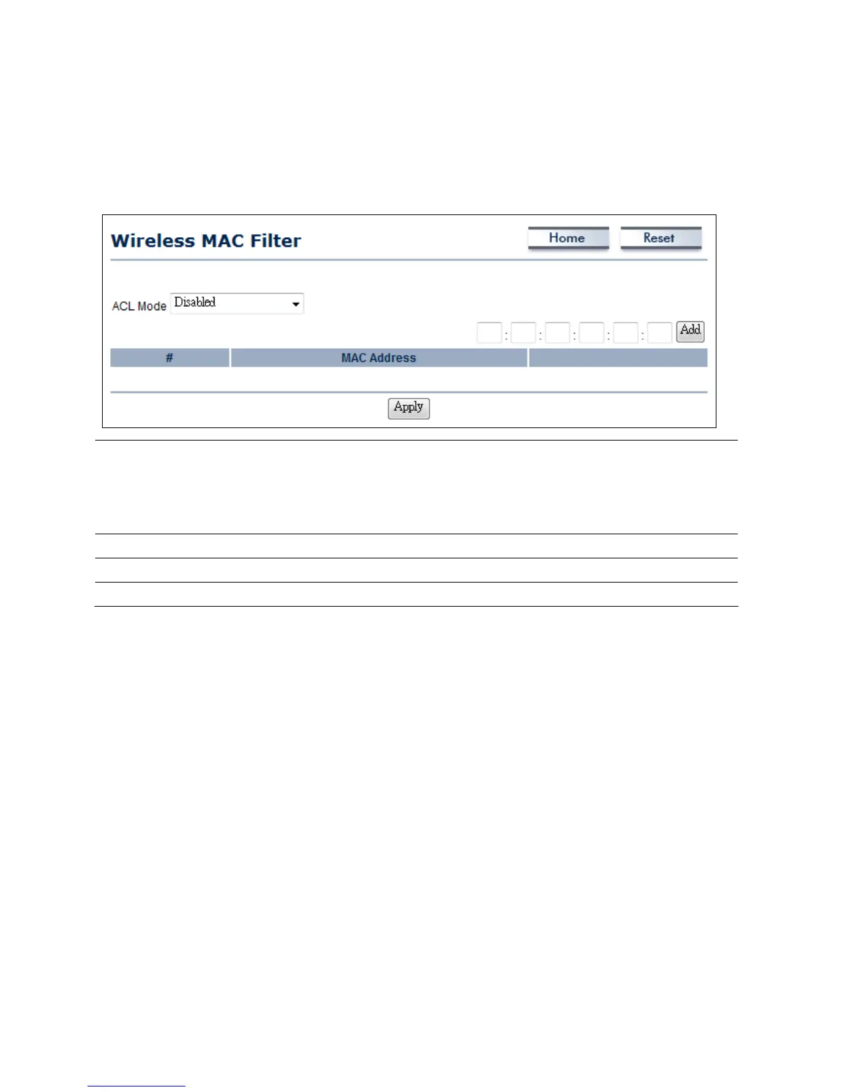 access ENH200. The default setting is Disable Wireless MAC Filters.