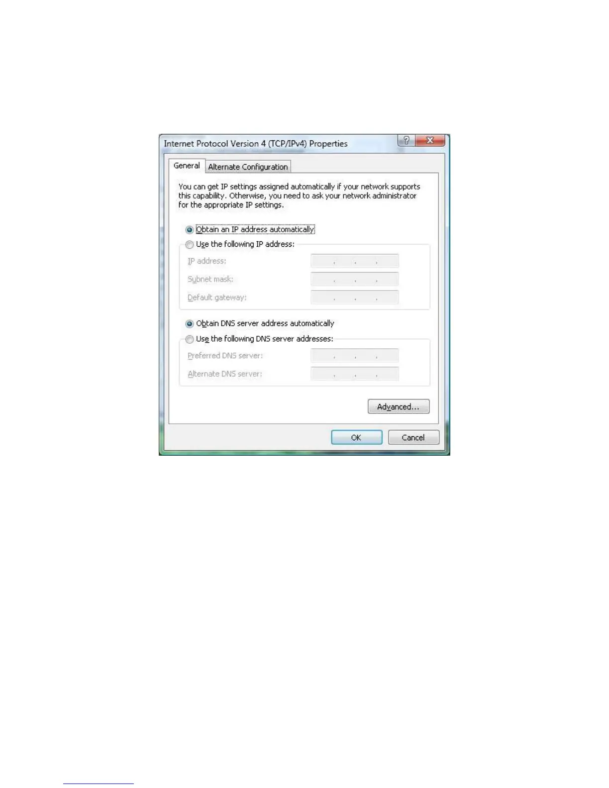 6. In the properties dialog box, click Use the following IP address: to configure your