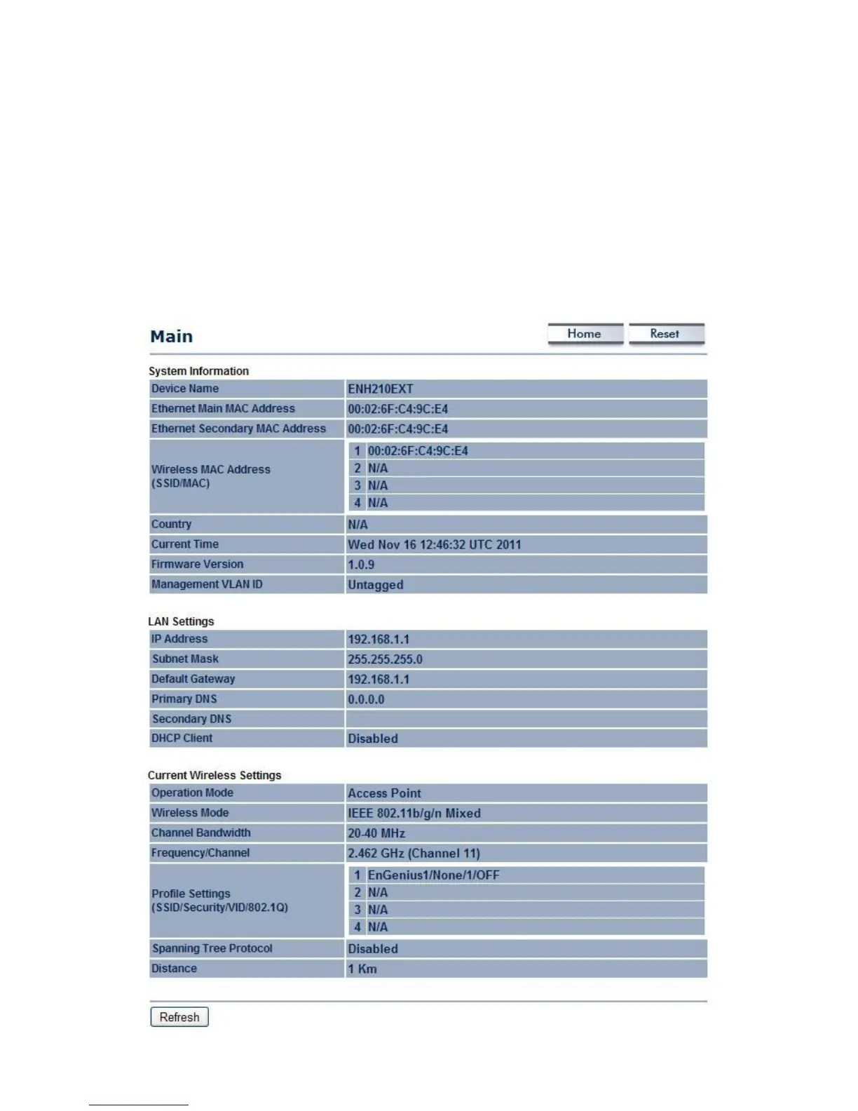 Click on the Main link under the Status side-bar menu or click Home from the top-right of