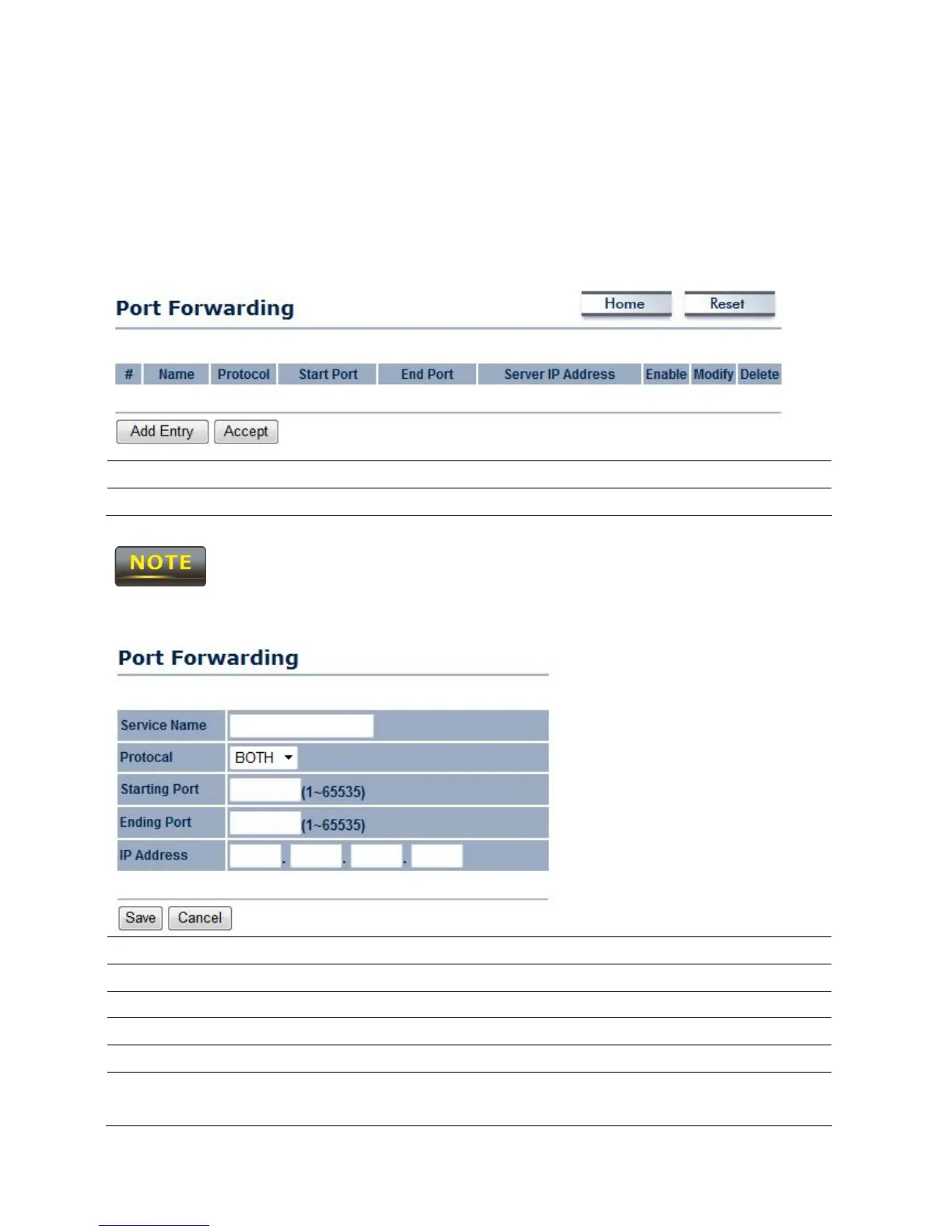 Add Entry Press Add Entry to add a rule of Port Forwarding.
