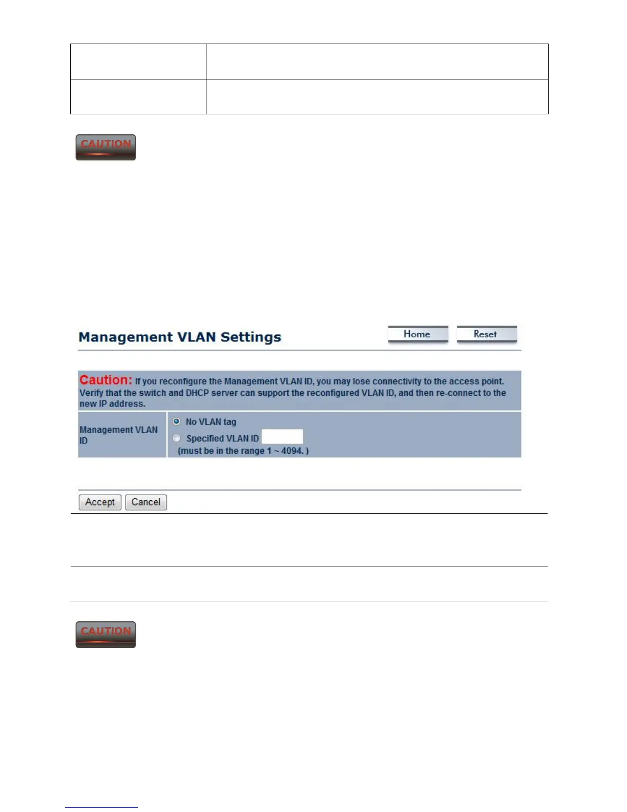 2. If you reconfigure the Management VLAN ID, you may lose connection to the