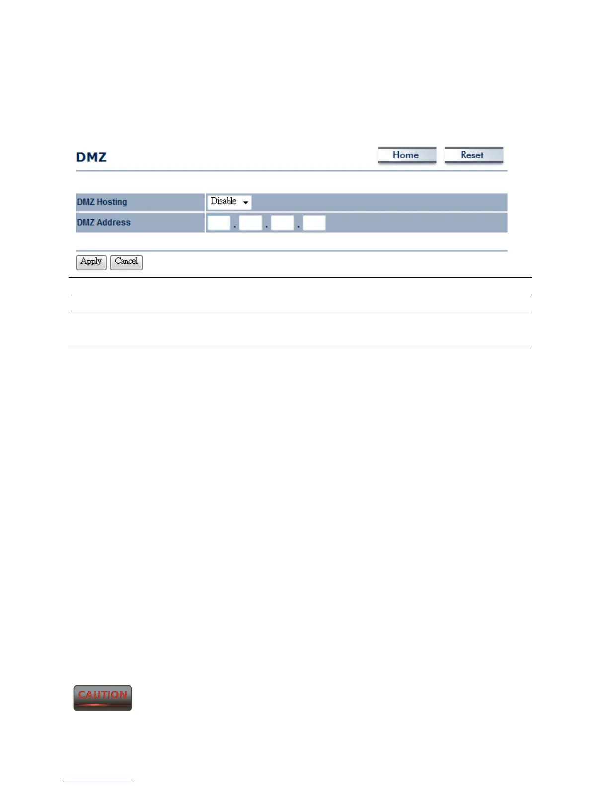 Enabling DMZ will expose the computer which is in the DMZ to the Internet. This feature may