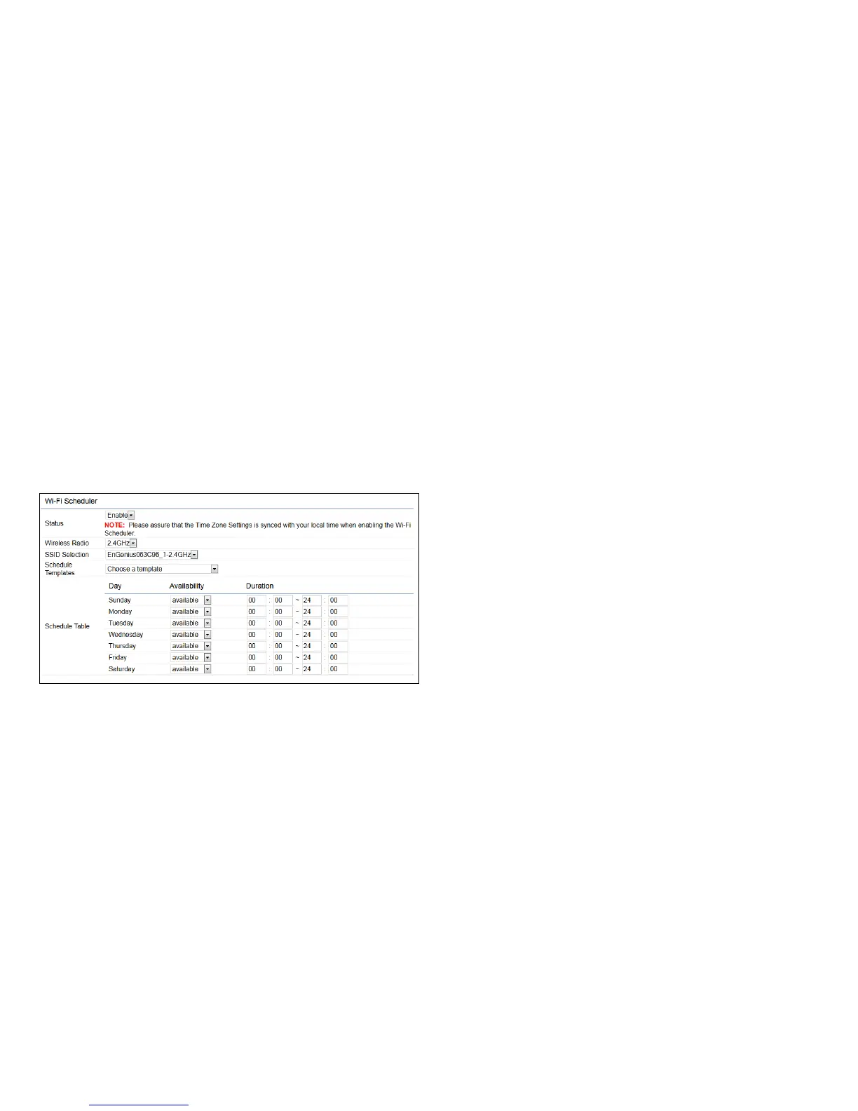 Status: Enables or disables the Wi-Fi scheduler function.