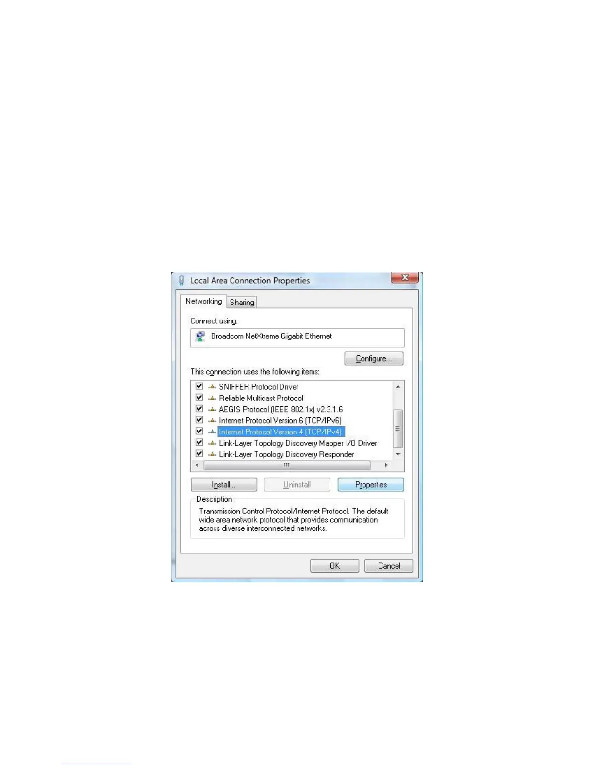 5. In the Local Area Connection Properties dialog box, verify that Internet Protocol