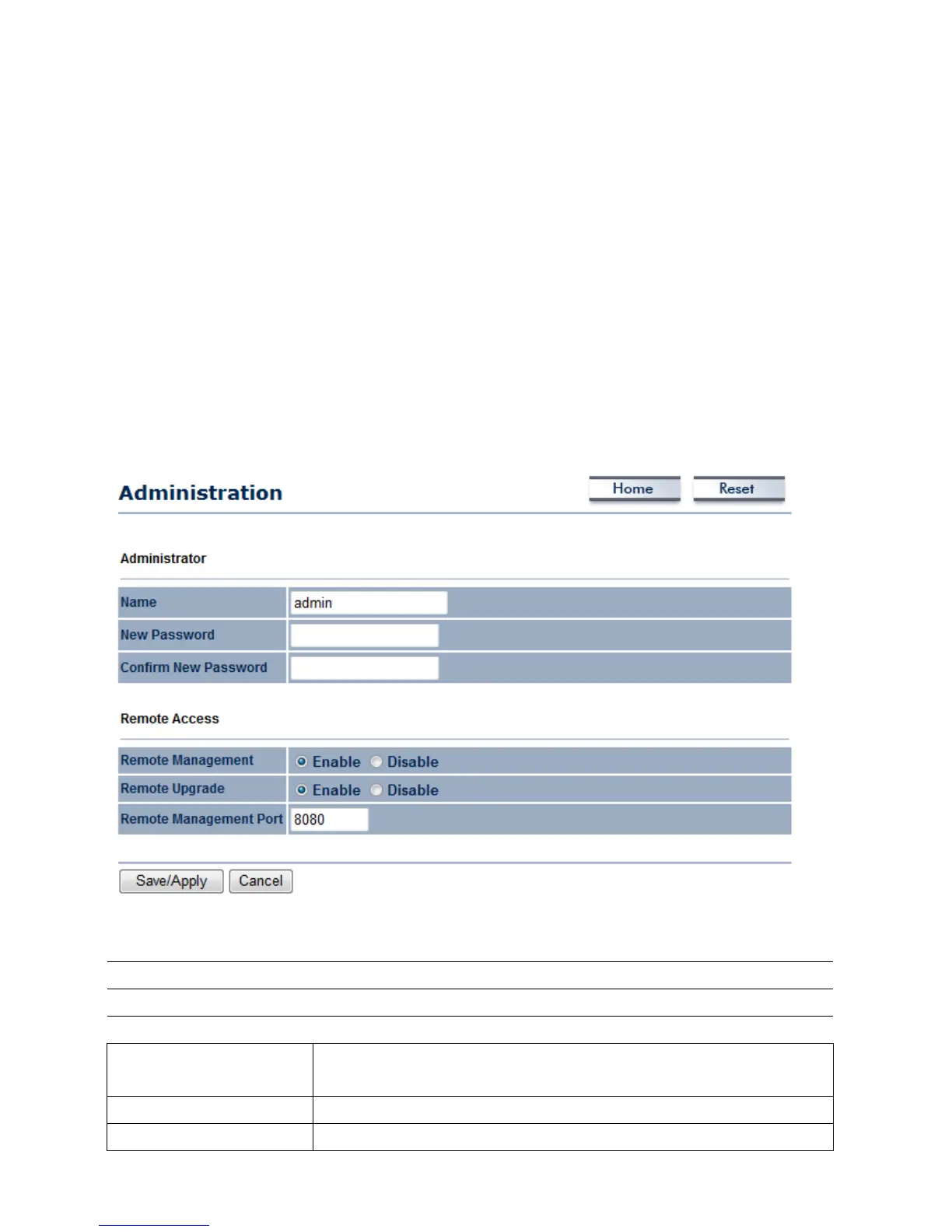Remote Management Select the Radio button to Enable or Disable Remote