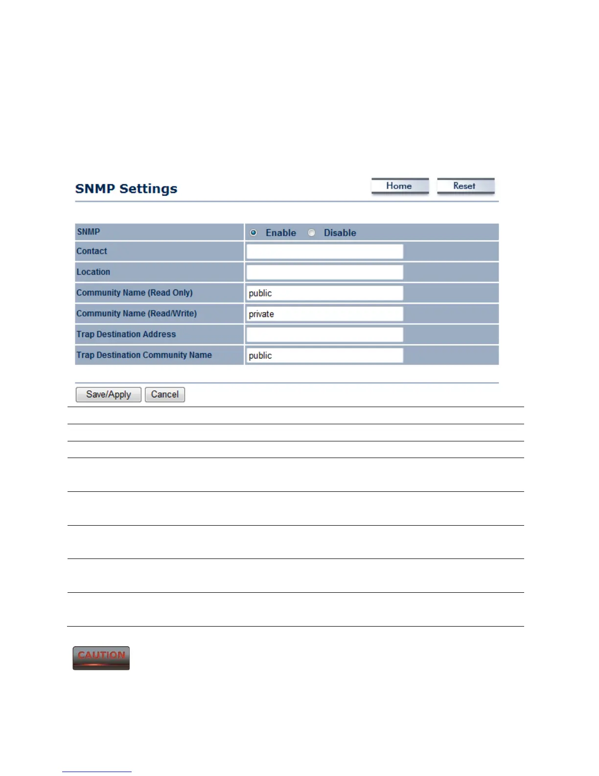 SNMP Enable/Disable Select the Radio button to Enable or Disable SNMP function.