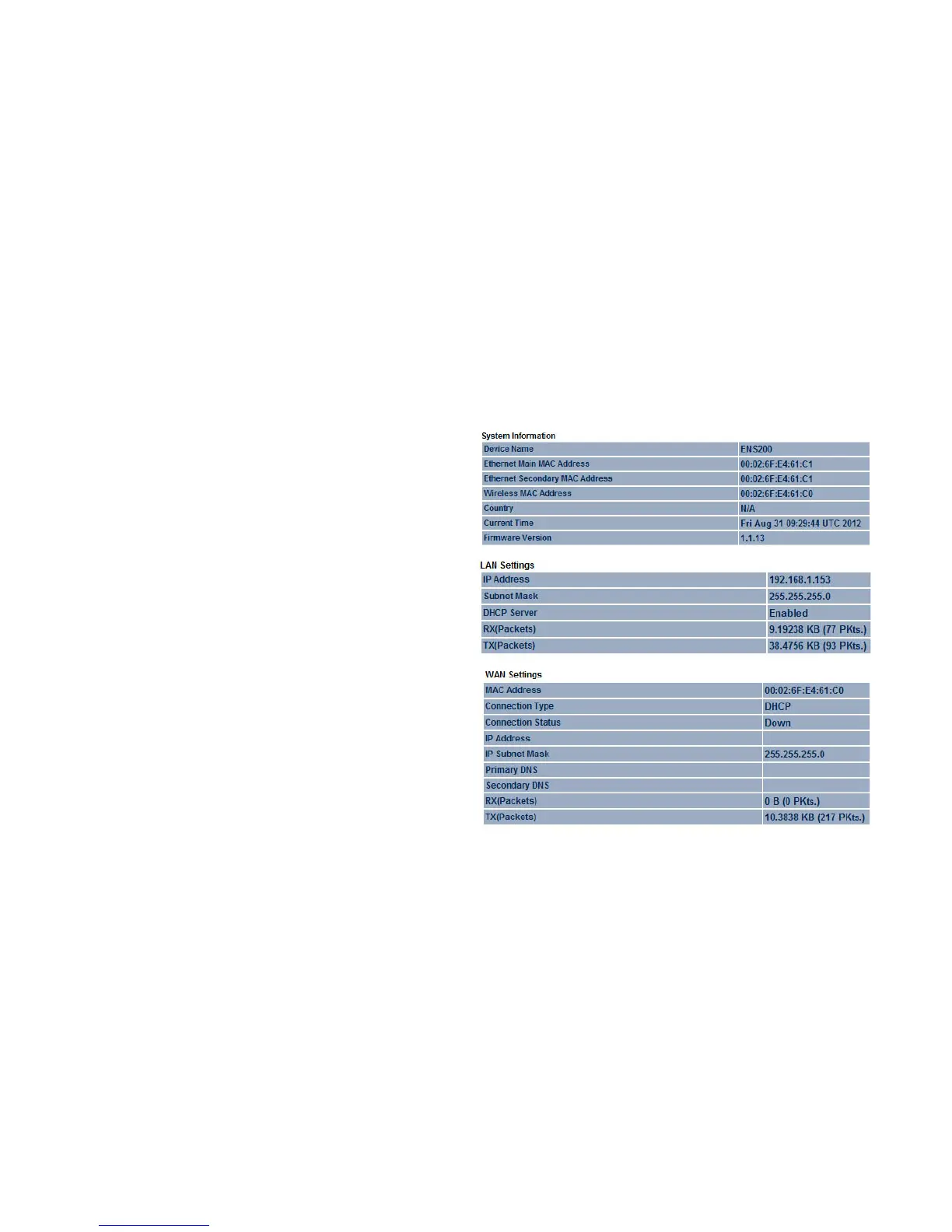 such as operating mode, system up time, firmware version, serial