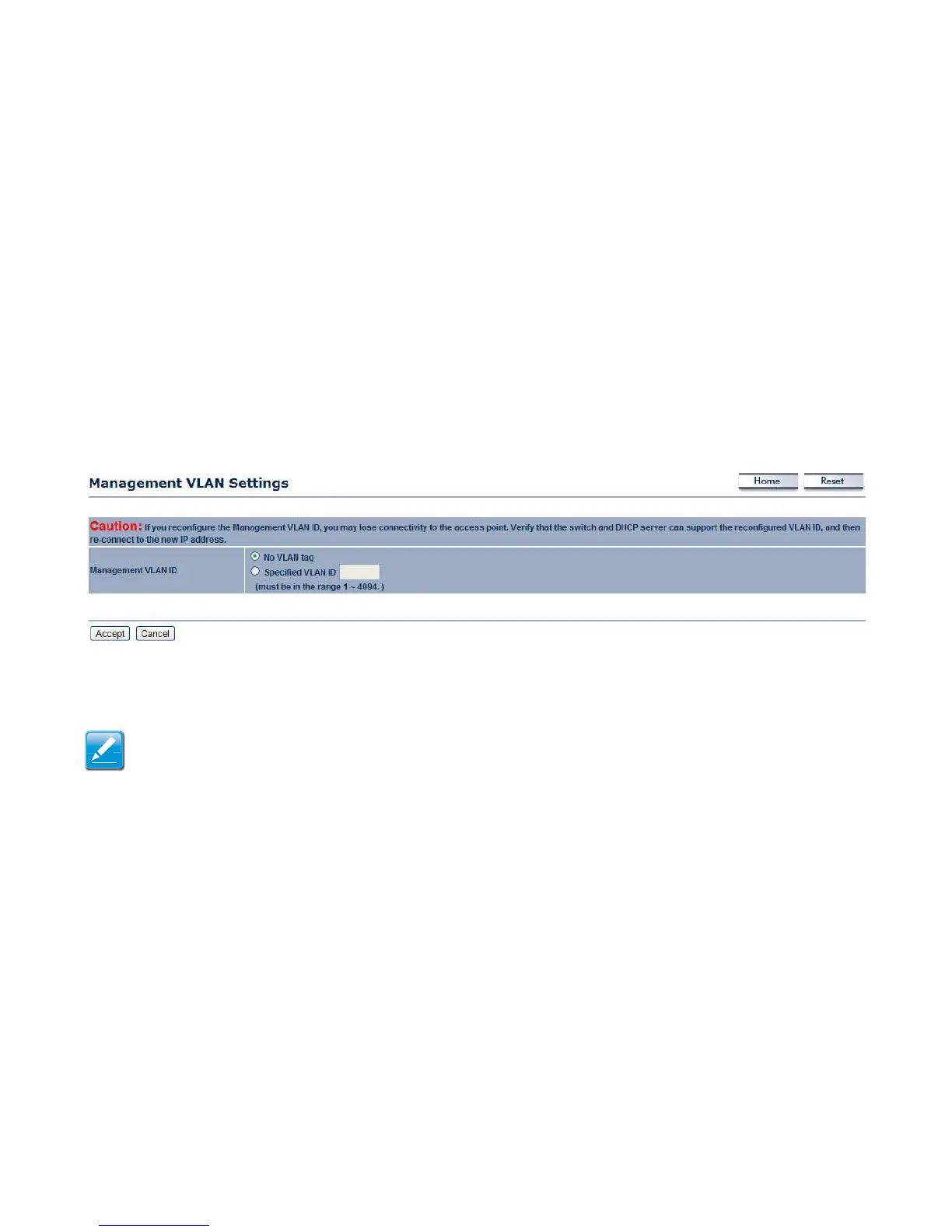 Management VLAN ID If your network includes VLANs and if tagged packets need to pass through the Access Point, enter the