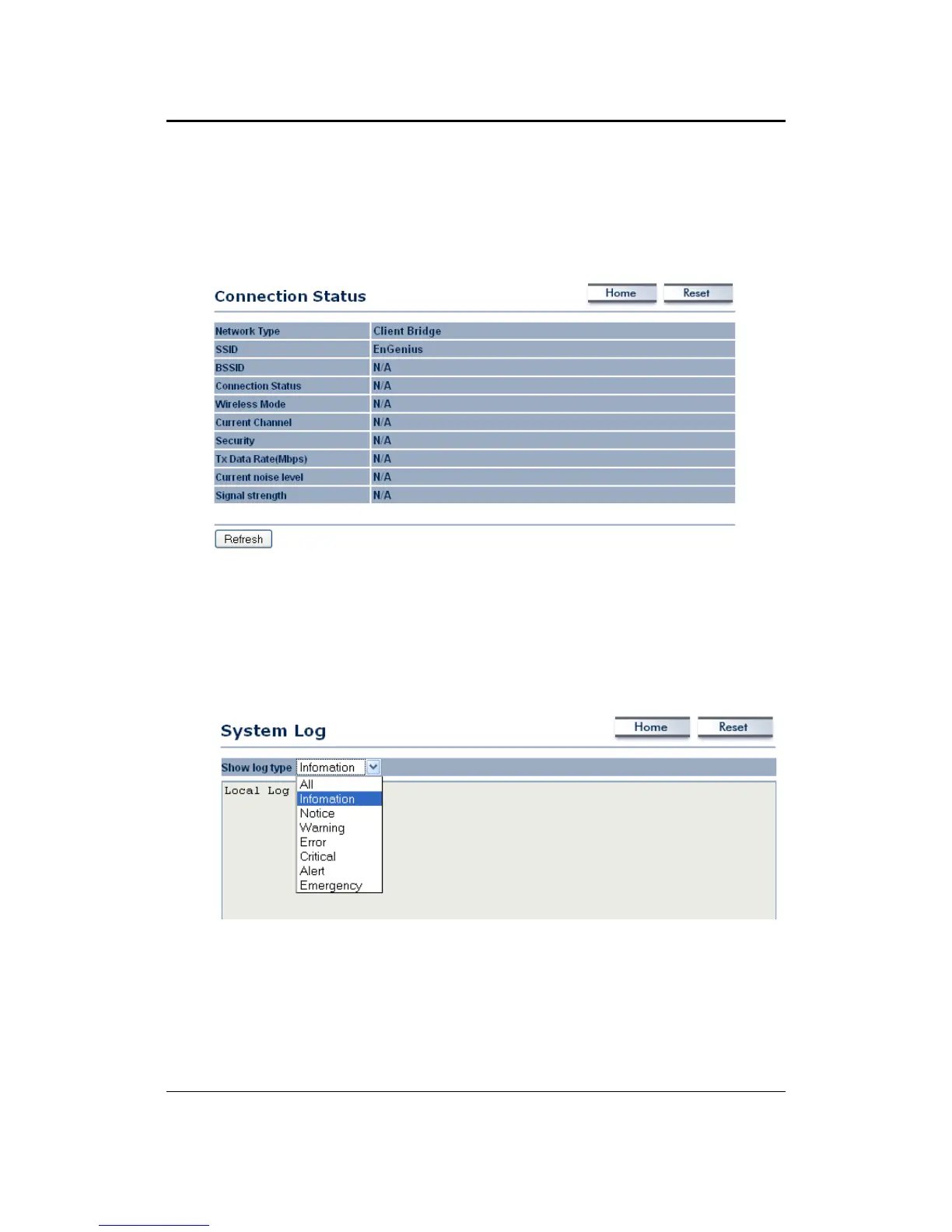 Click on the System Log link under the Status drop-down menu. The device