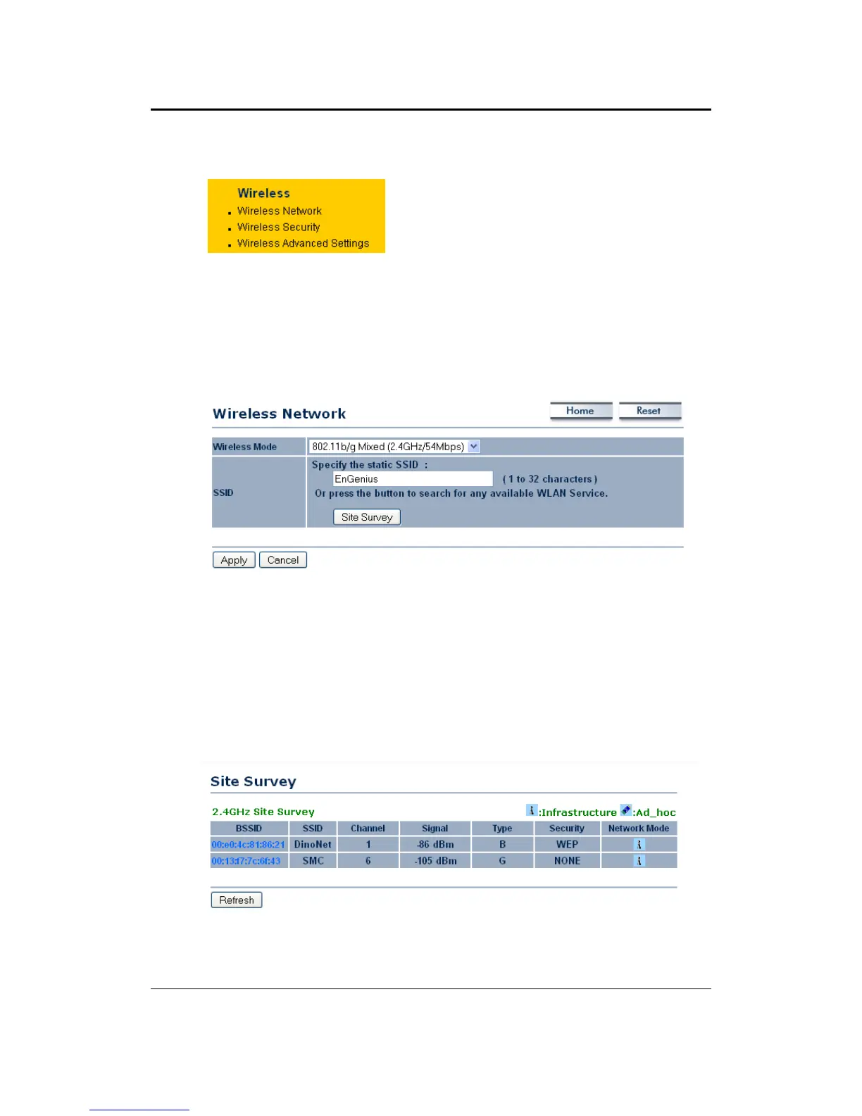 Site Survey: Click on the Site Survey button in order to scan the 2.4GHz frequency