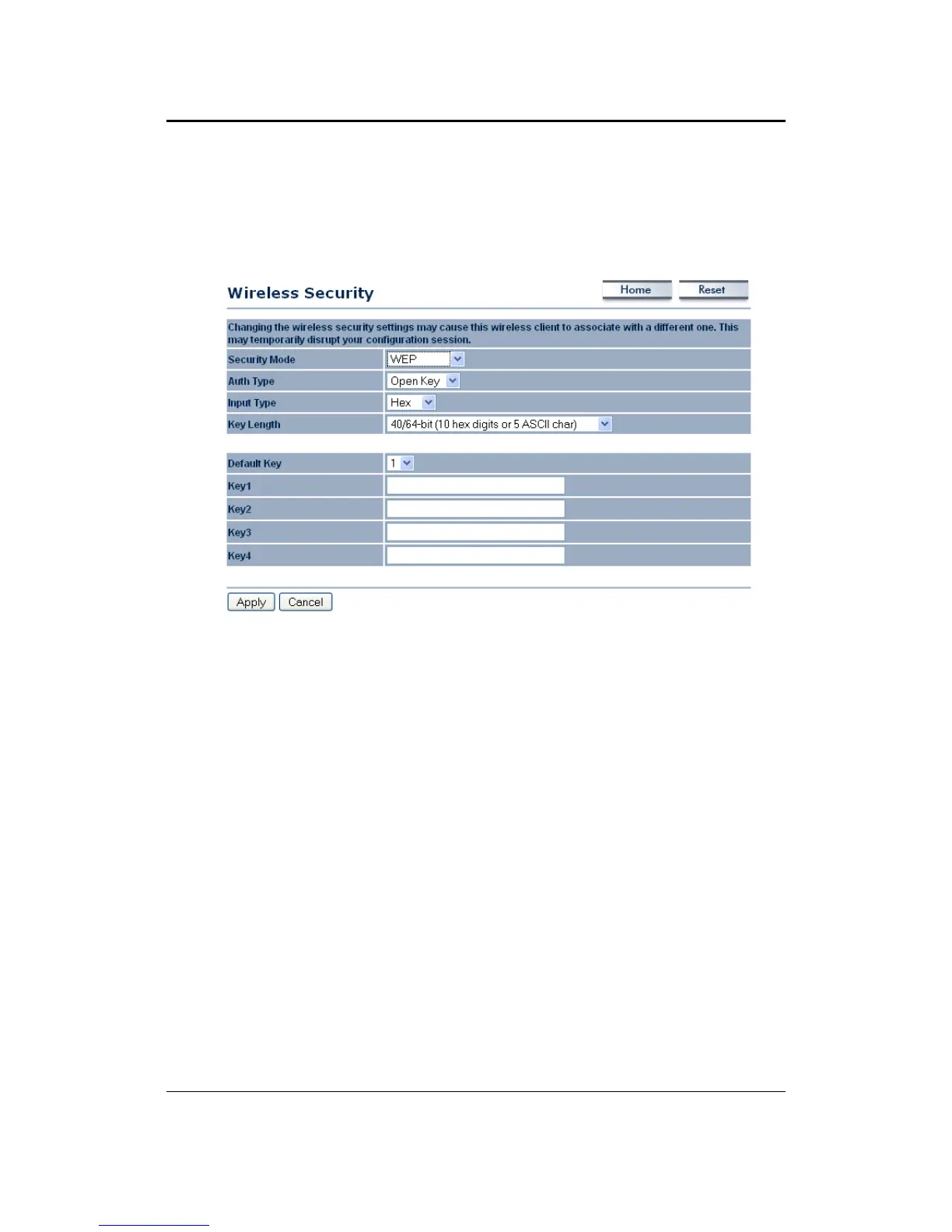 Key 1-4: You may enter four different WEP keys.