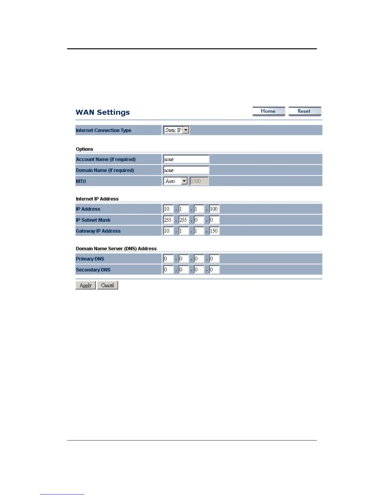The WAN interface can be configured as Static IP address. In this type of connection,