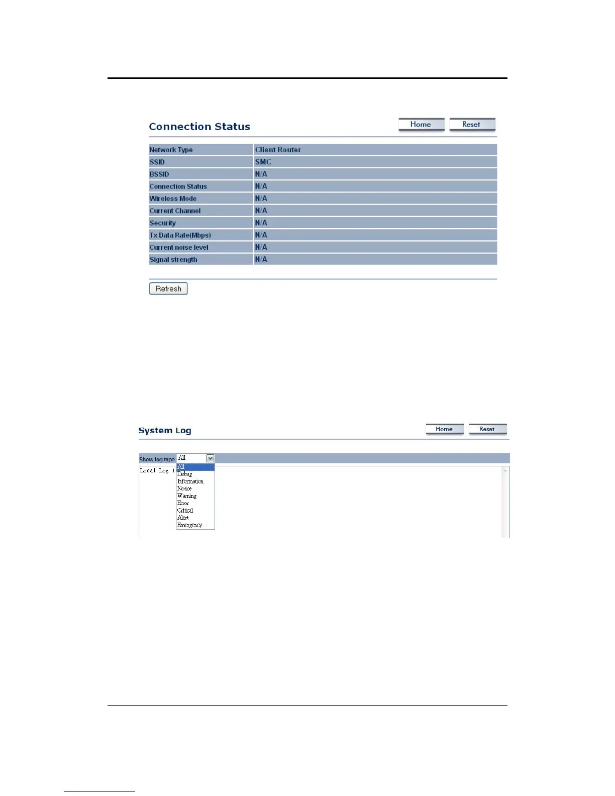 Click on the System Log link under the Status drop‐down menu. The device