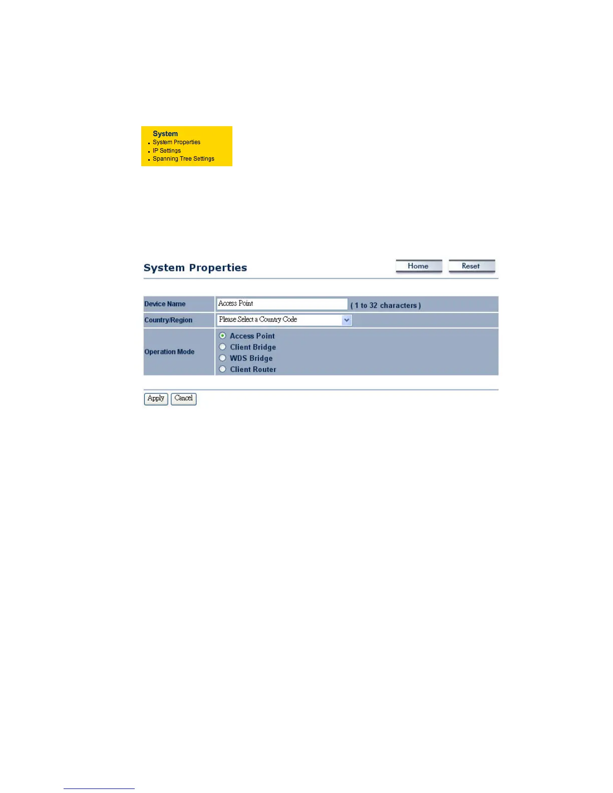 ThispageallowsyoutoswitchtheOperatingModeofthedevice,aswellasspecifyanameand