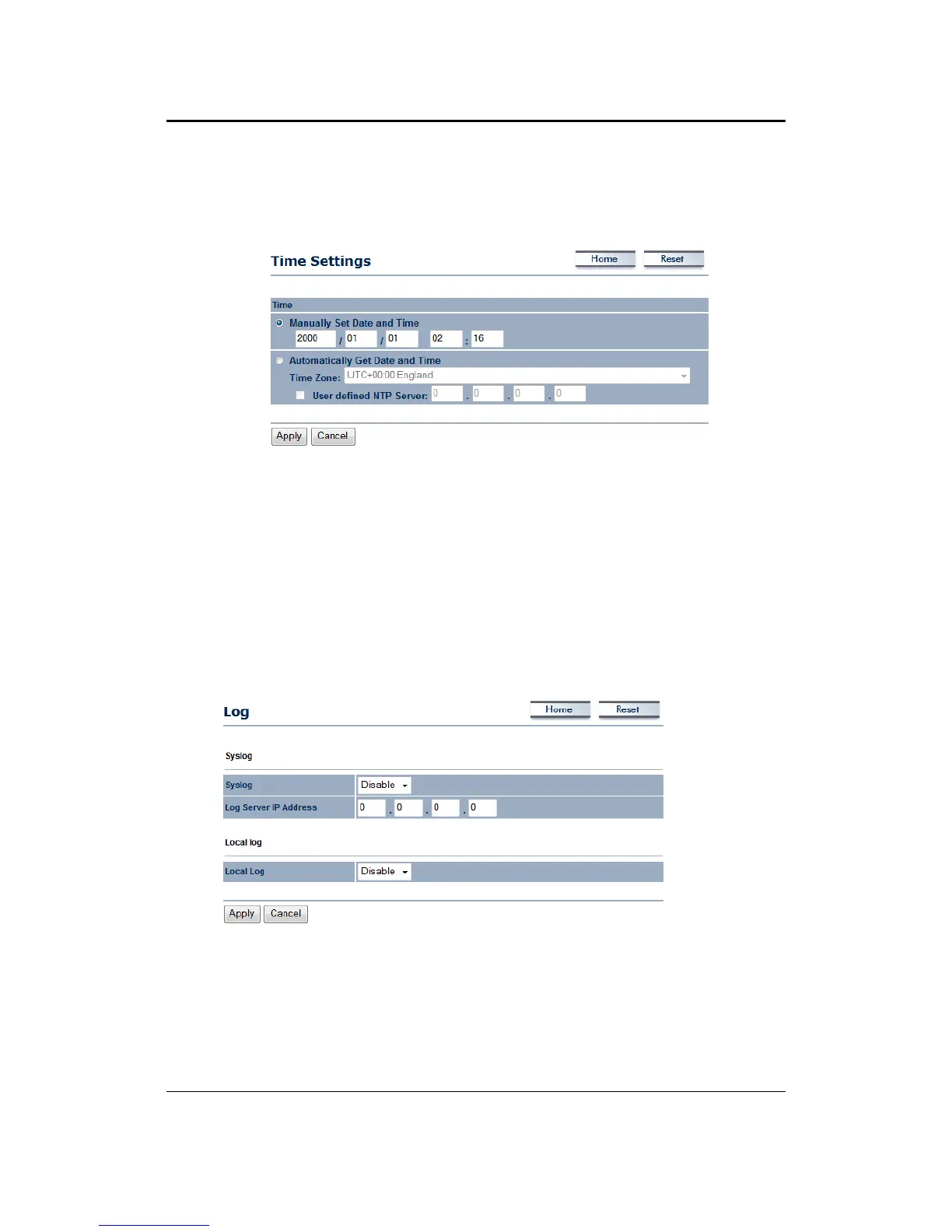 This page allows you to configure the time on the device. You may do this manually or by