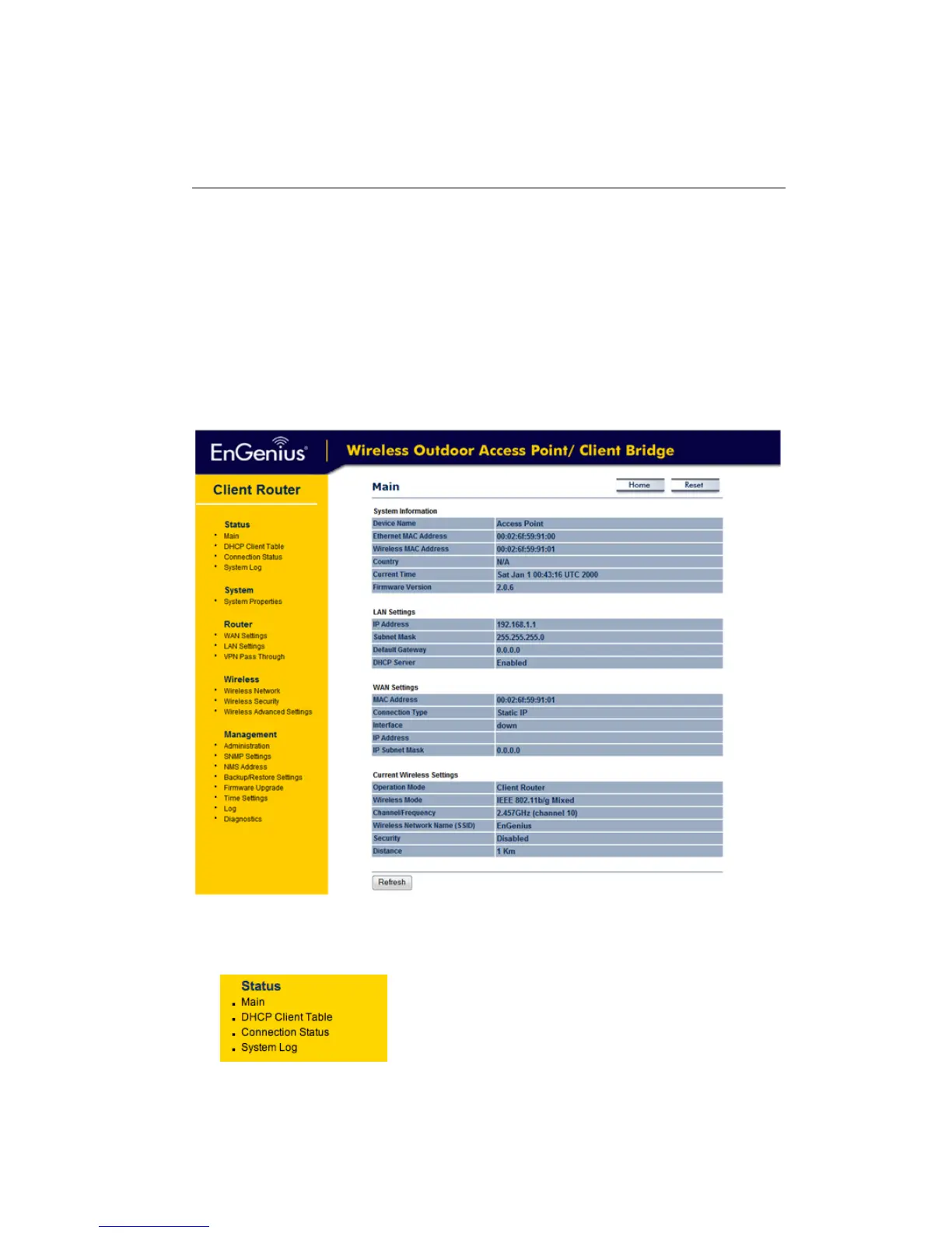 1. Status:Displaystheoverallstatus,DHCPclienttable,connectionstatusandsystemlog.