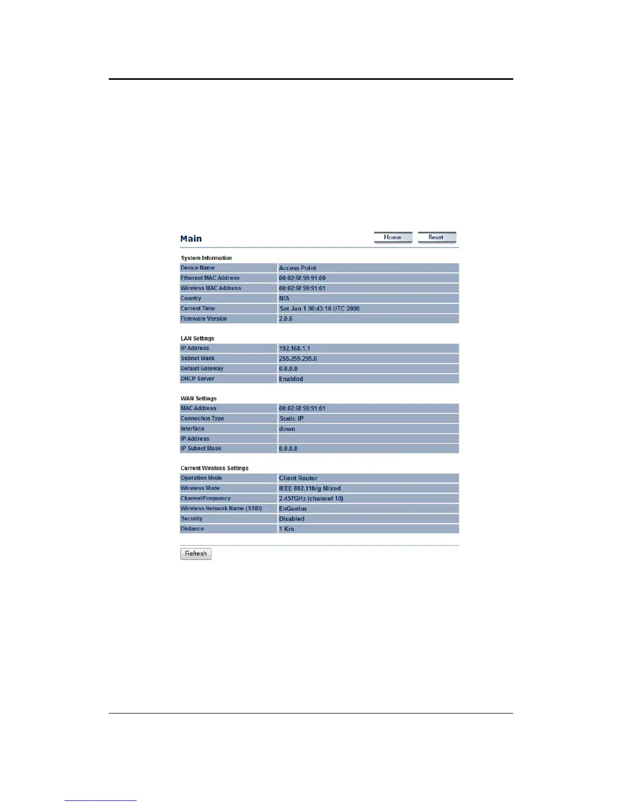Settings’section displays Operation Mode, Wireless Mode, Channel/Frequency, SSID, Security