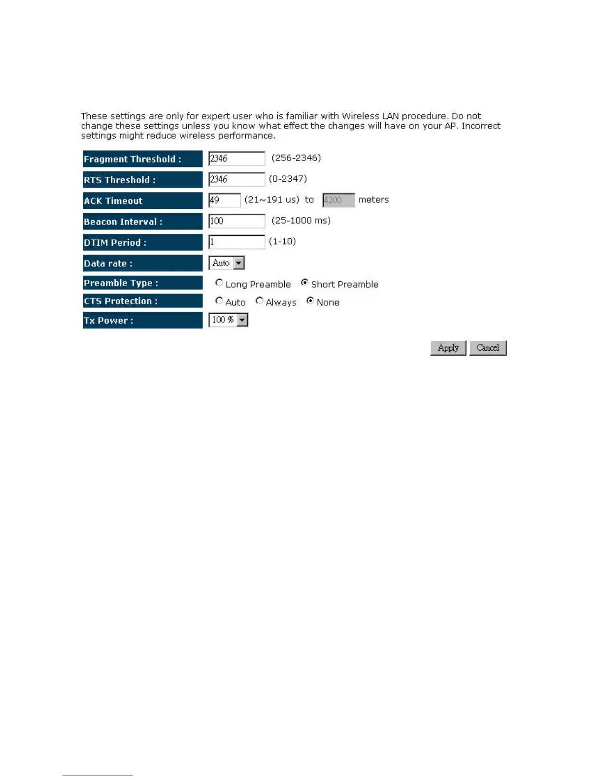 ¾ RTSThreshold:PacketsoverthespecifiedsizewillusetheRTS/CTSmechanismtomaintain