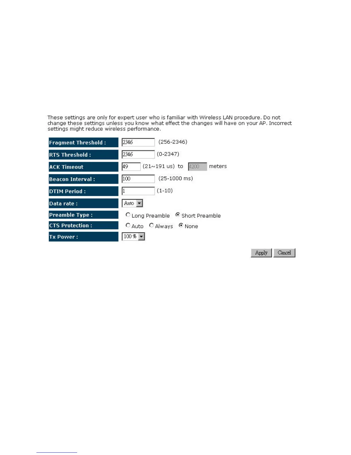 ¾ RTSThreshold:PacketsoverthespecifiedsizewillusetheRTS/CTSmechanismtomaintain