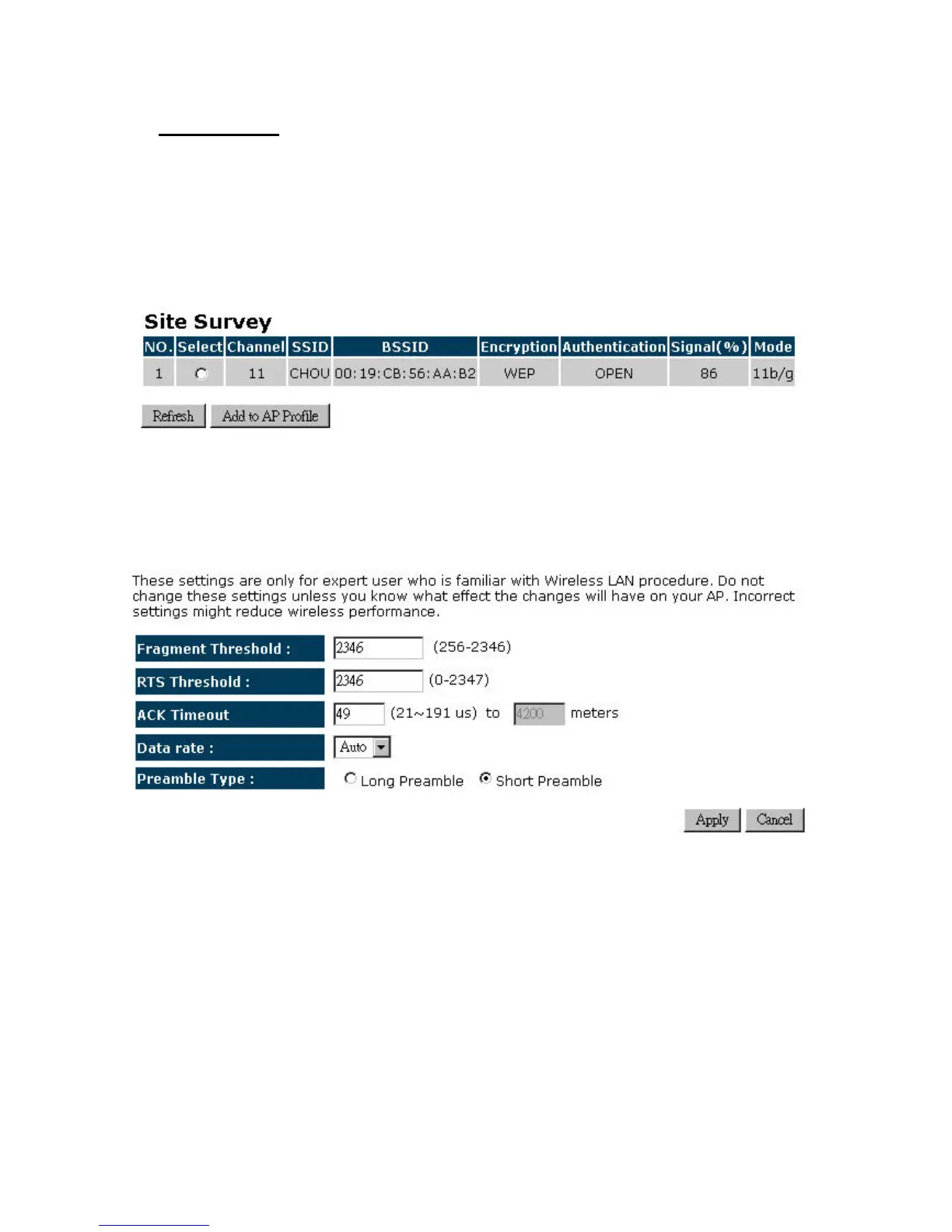Click on the Site Survey button to view a list of Access Points in the area. The Site Survey page