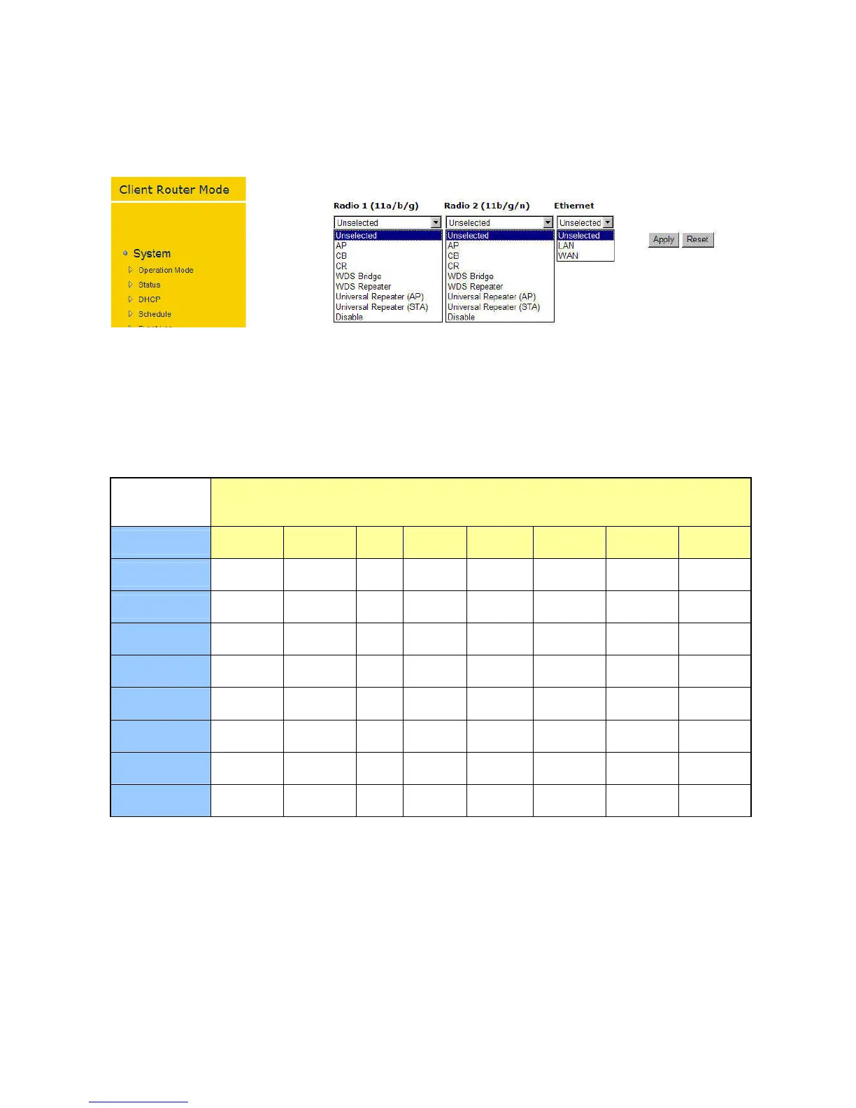 Radio2(11/b/g/n) AP CB CR WDSBridge WDSRepeater UR(AP) UR(STA) Disable