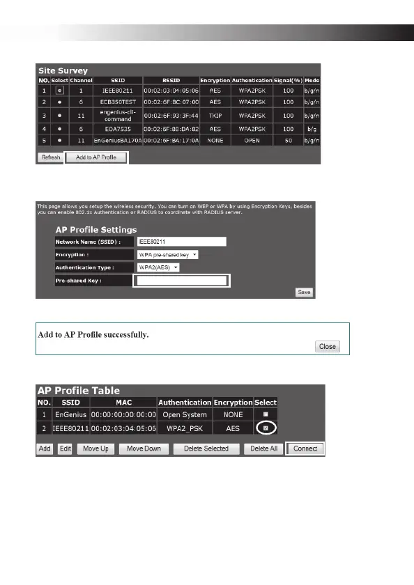 If the target router uses encryption, enter the password in Pre-shared Key and click