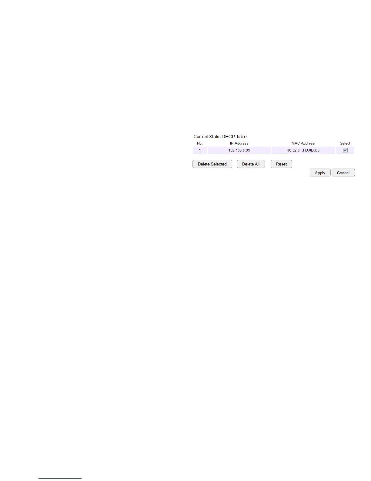 Click to select static DHCP client devices to be deleted.