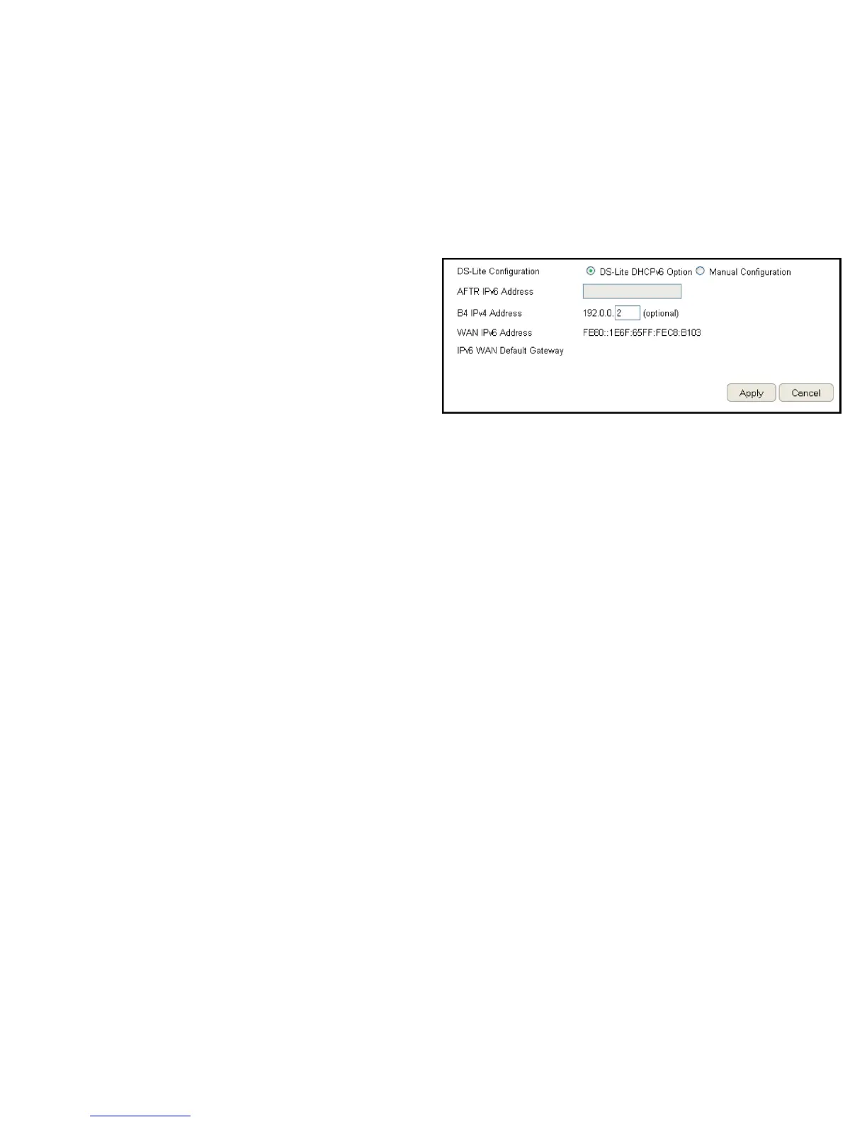 Select DS-Lite DHCPv6 Option or Manual Conguration