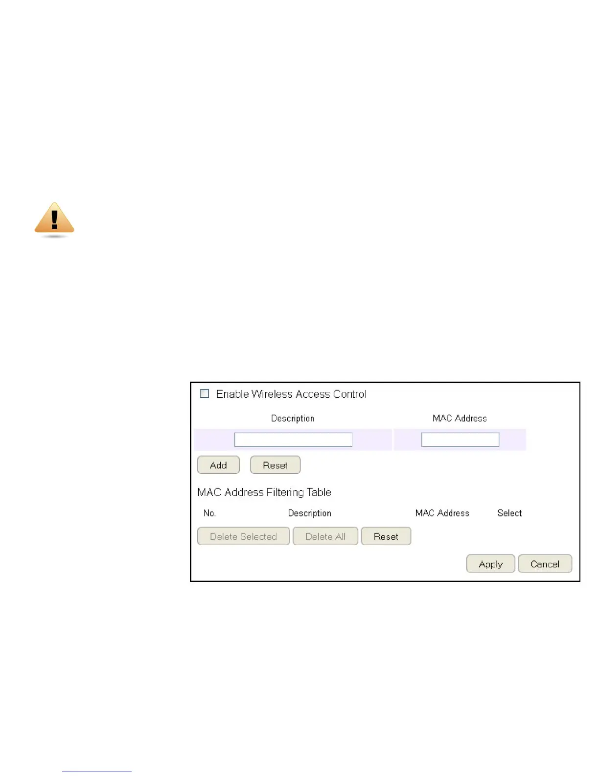 WhenEnableWirelessAccessControlisselected,onlywirelessclientswithMACaddresseslistedinthetableareallowedtoconnect