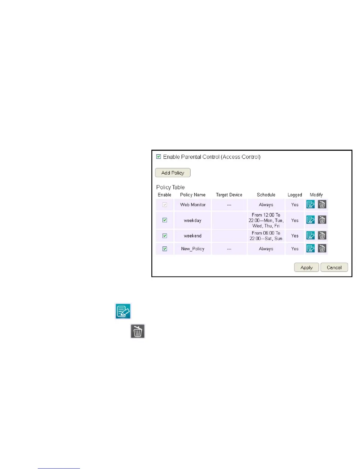 Availableparentalcontrolpoliciesareshowninatableandeachpolicycanbeenabledordisabled,edited,anddeleted.