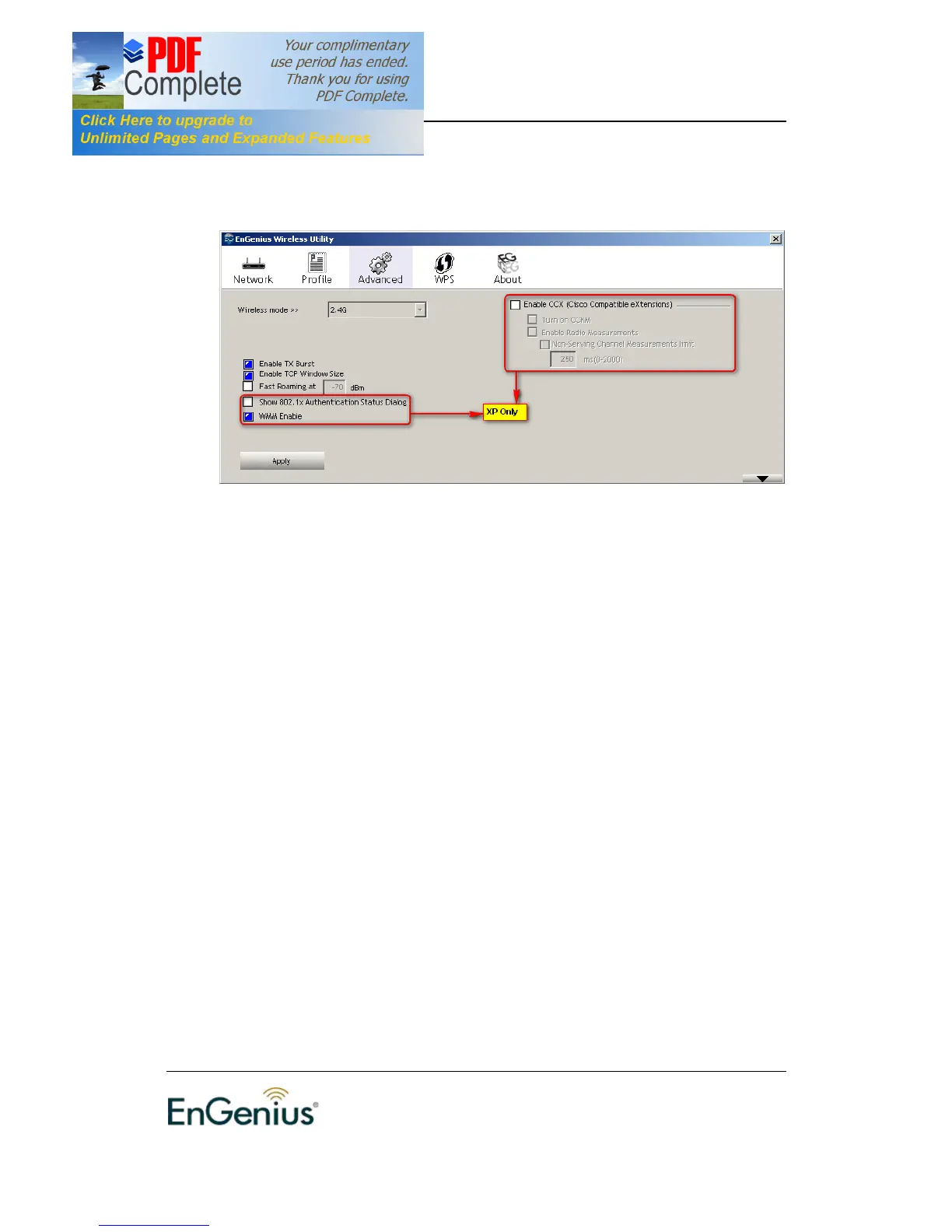 The Advanced tab is used to configure Tx burst, WMM, and CCX.