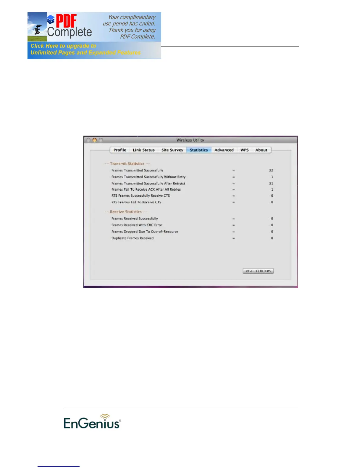 The Statistics tab displays transmit and receive packet statistics in real-time.