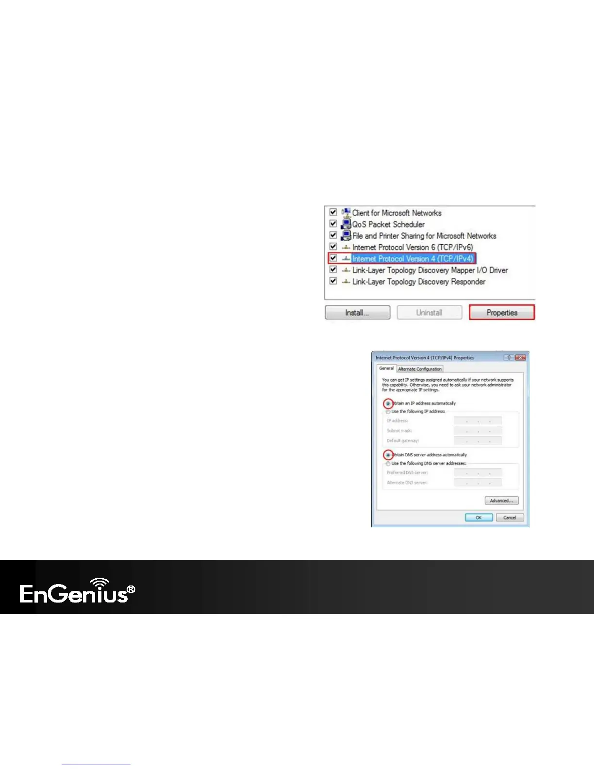 Select “Obtain an IP Address automatically” and “Obtain DNS server
