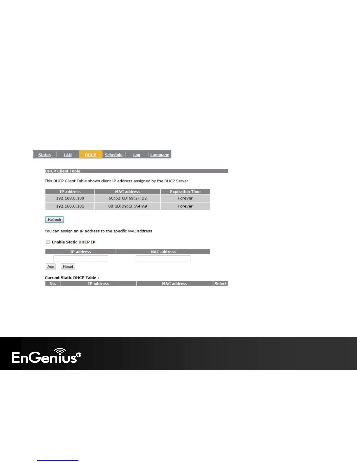 This page shows the status of the DHCP server and also allows you to control how the IP addresses are allocated.