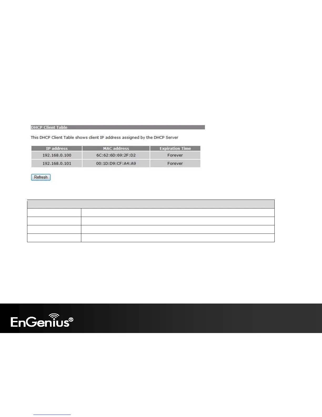 The DHCP Client Table shows the LAN clients that have been allocated an IP address from the DHCP Server